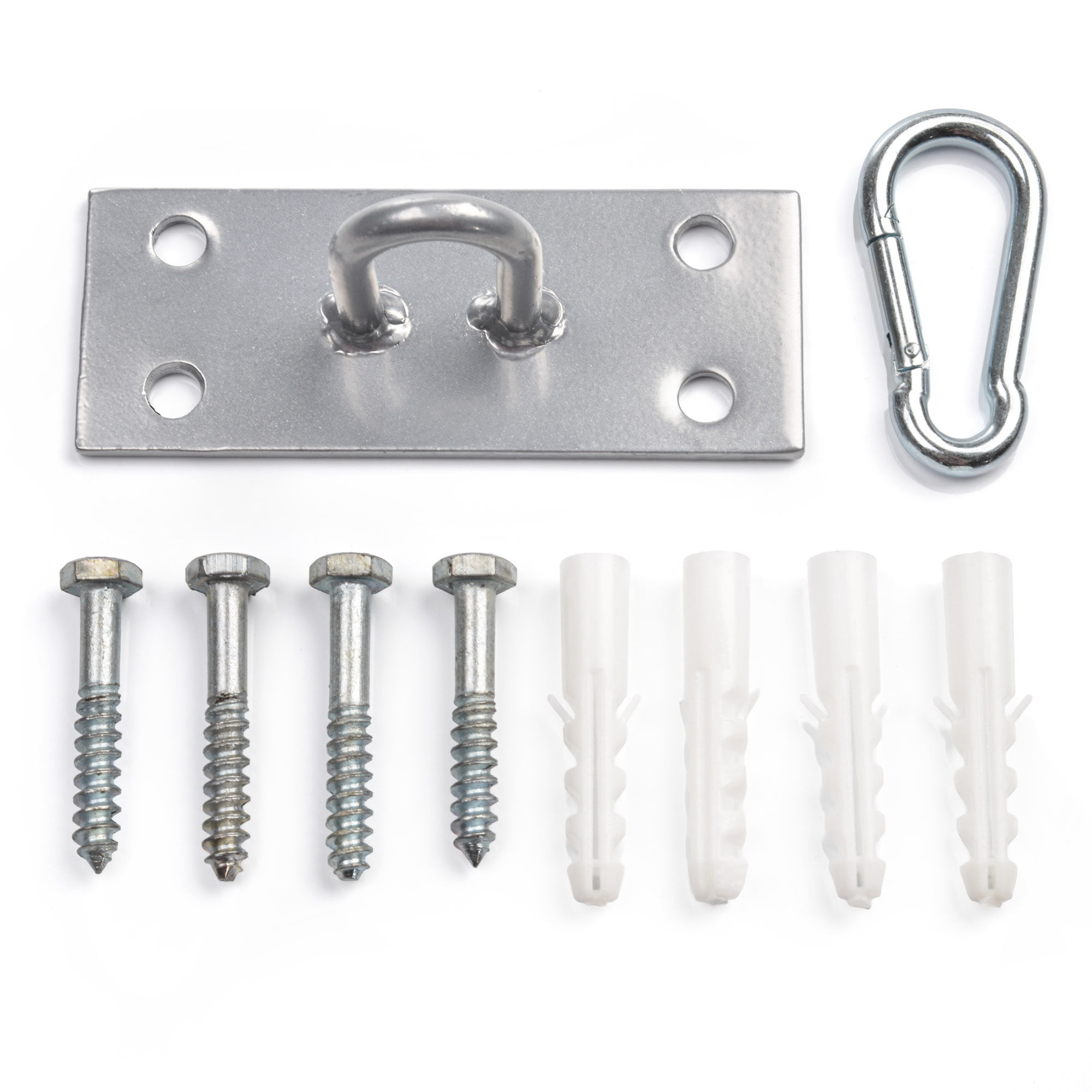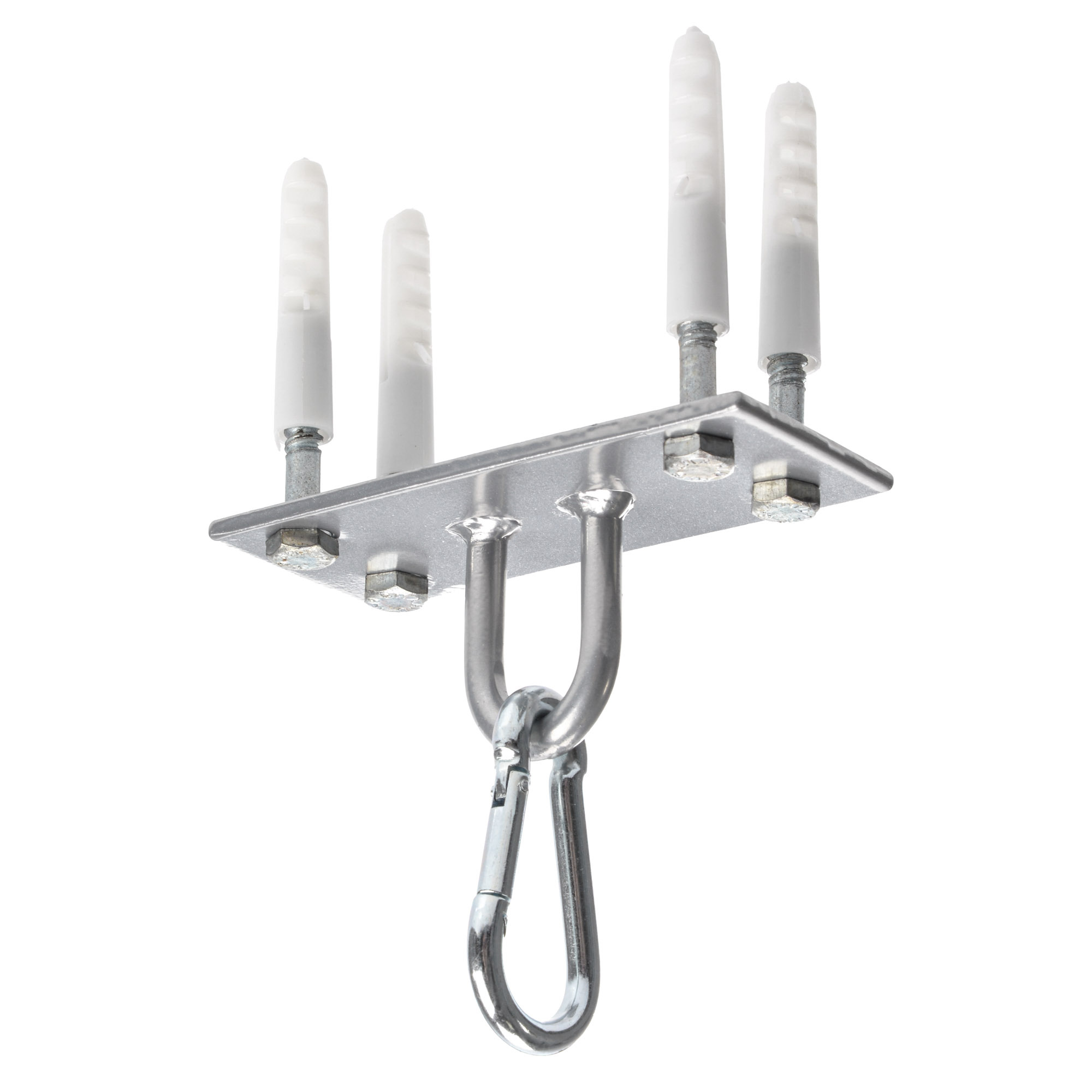 The steel bracket, measuring 12.5x5 cm, consists of a 0.4 cm steel plate, a mounting bracket, and a carabiner. Installed using 4 expansion plugs and screws (included in the set), it provides a stable and secure suspension, capable of withstanding the most intense training sessions.