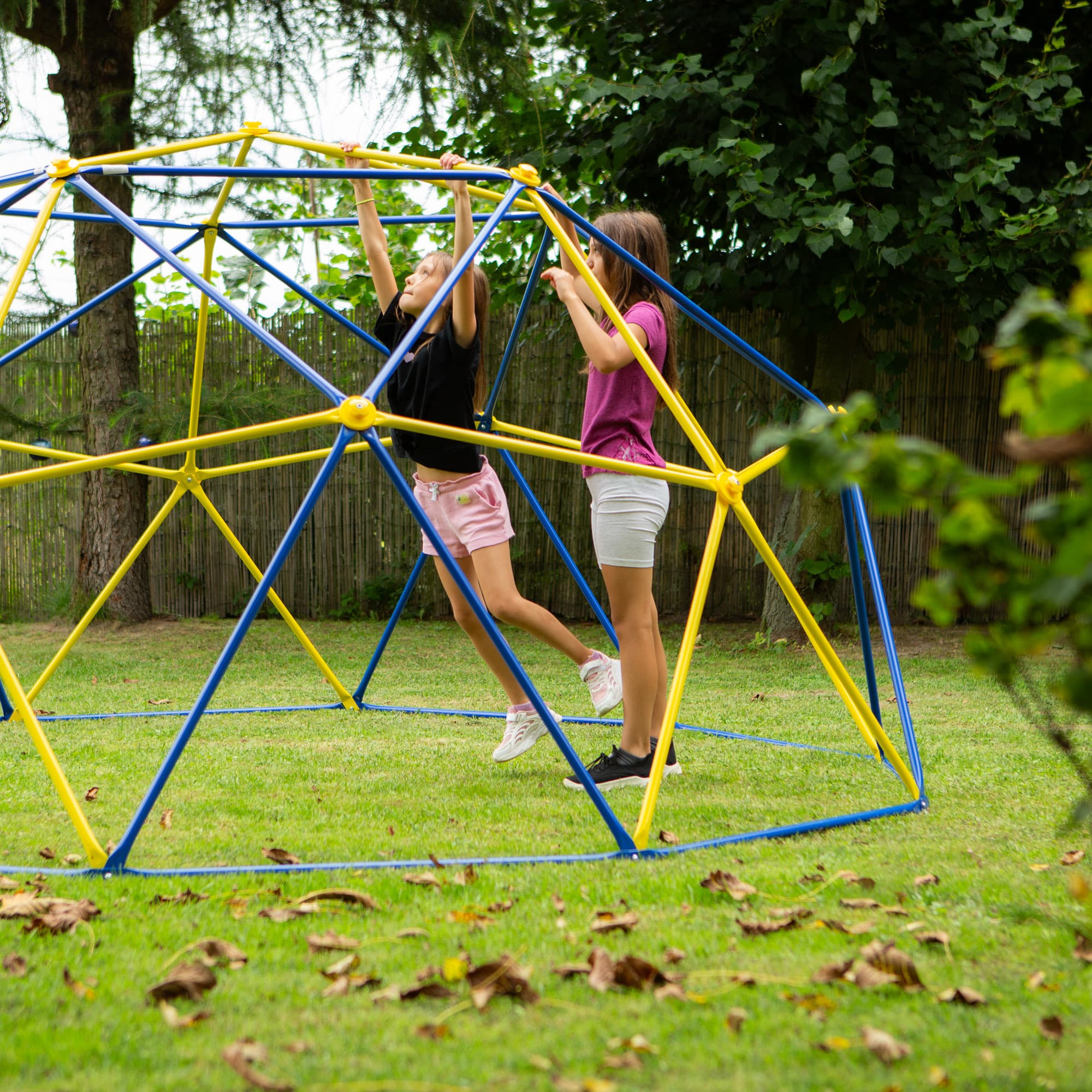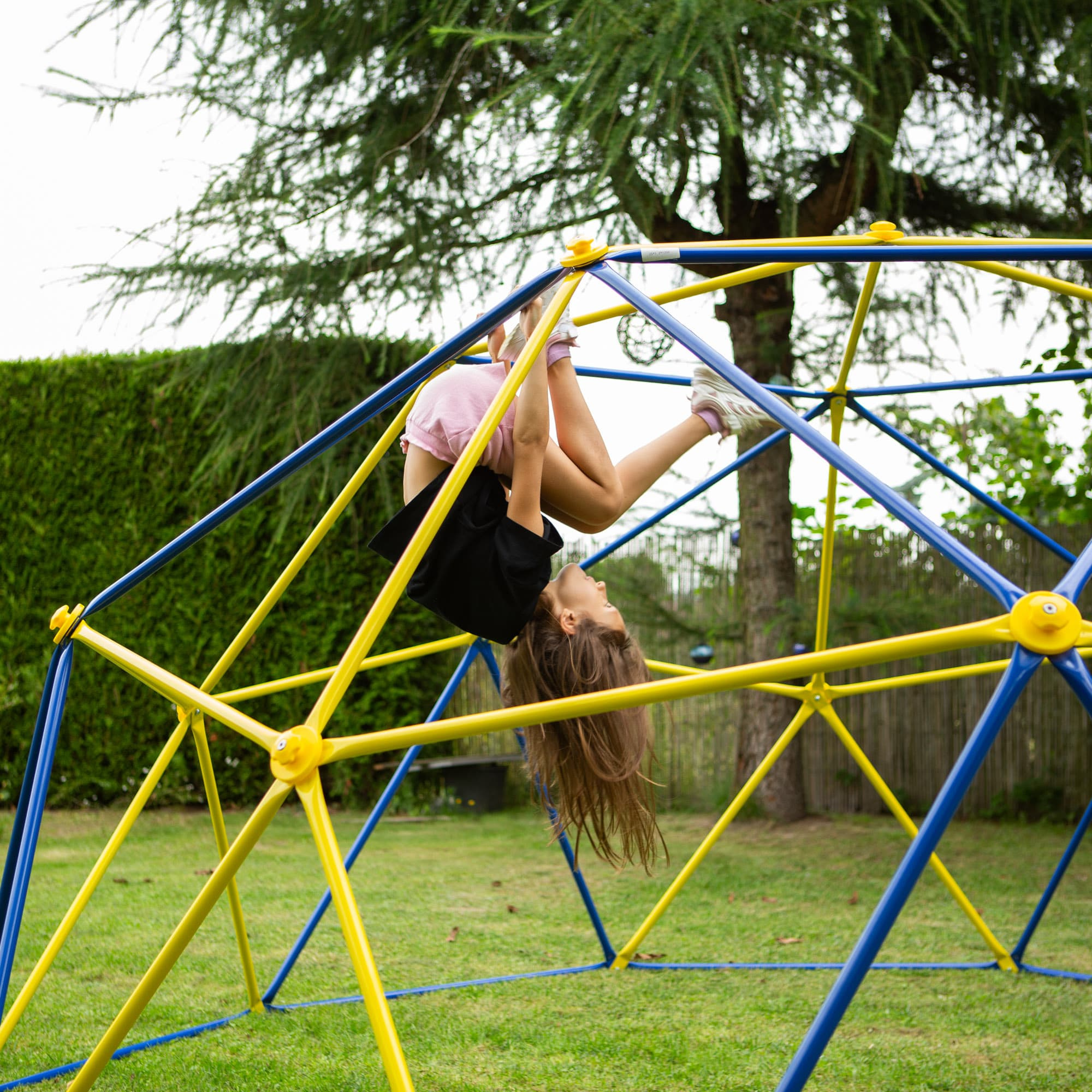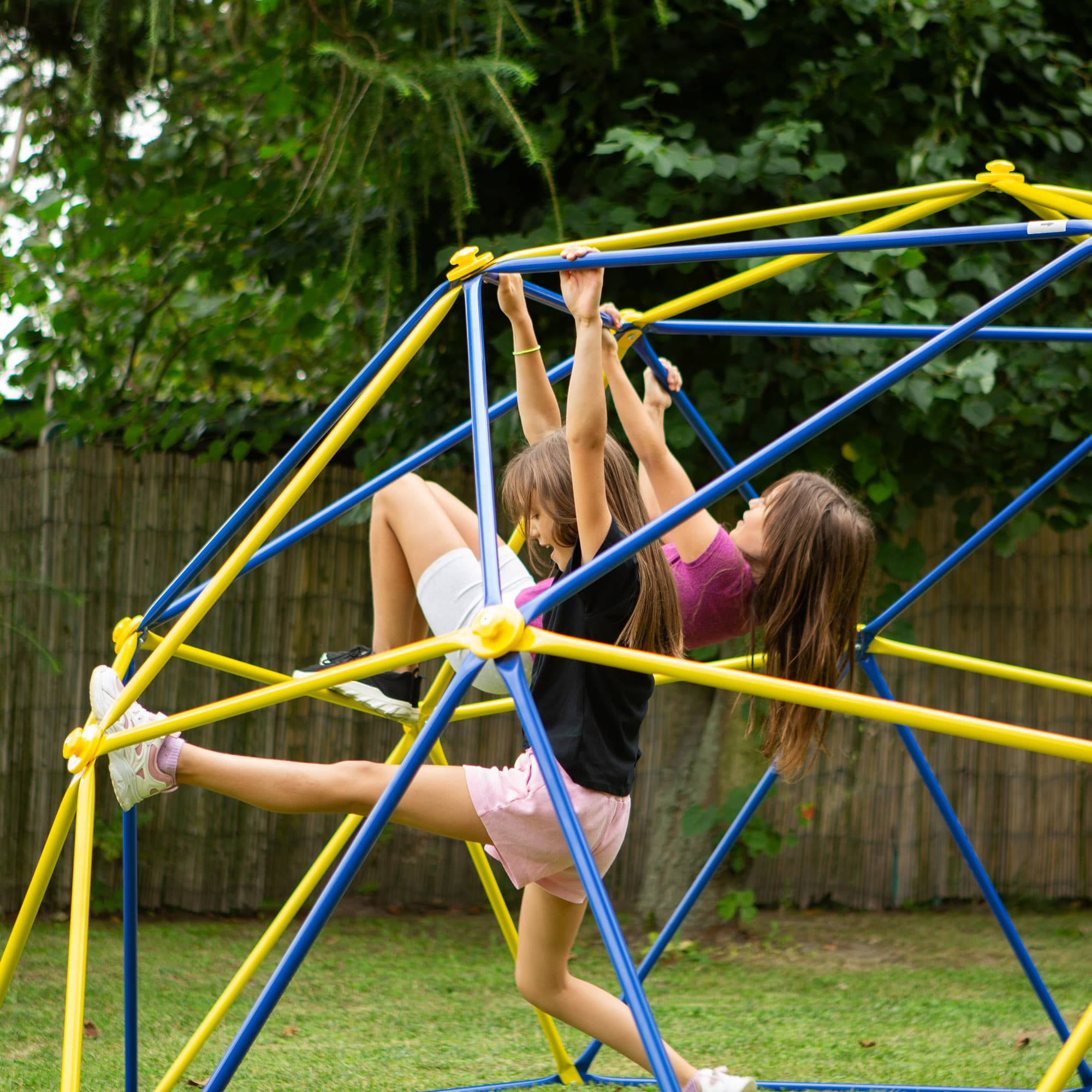 The geometric climbing dome is made of galvanised steel tubes. The external layer is powder-coated to prevent rust and fading. Connected with grips (which are also useful for climbing), the structure is durable and stable. The wide shape of the dome means no ground anchoring is needed for assembly. It can accommodate up to 12 people at once, with a maximum load capacity of 350kg, making it a safe play environment.