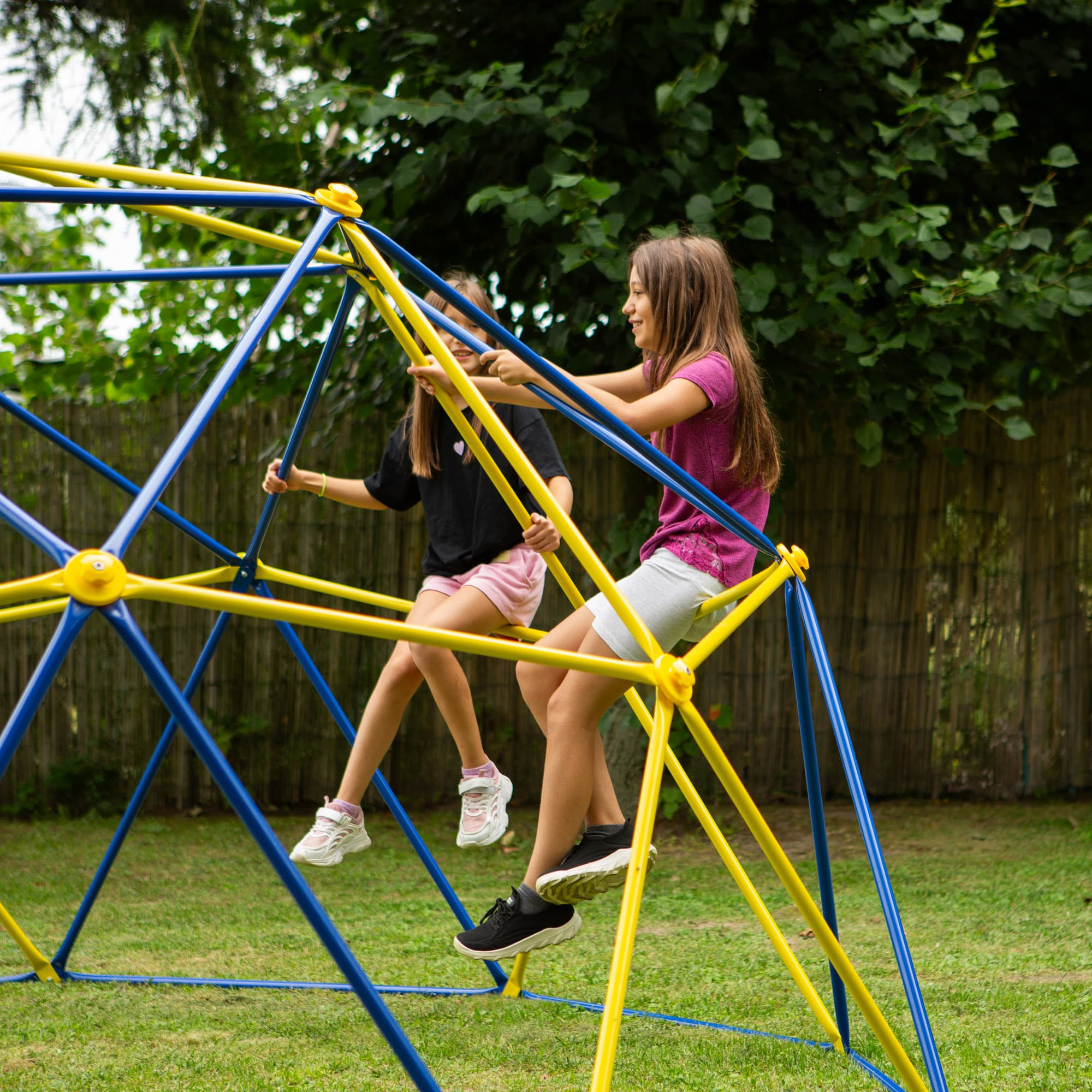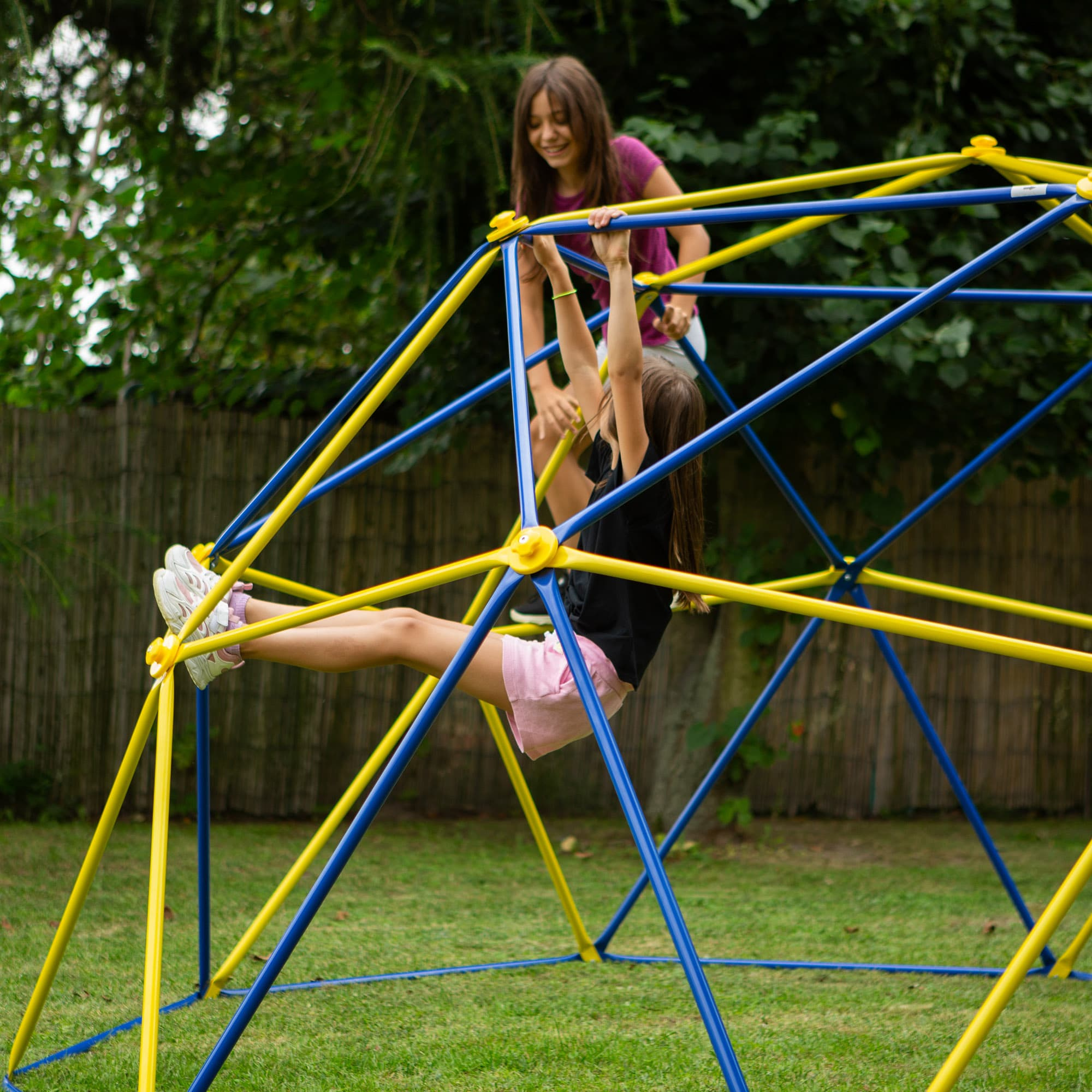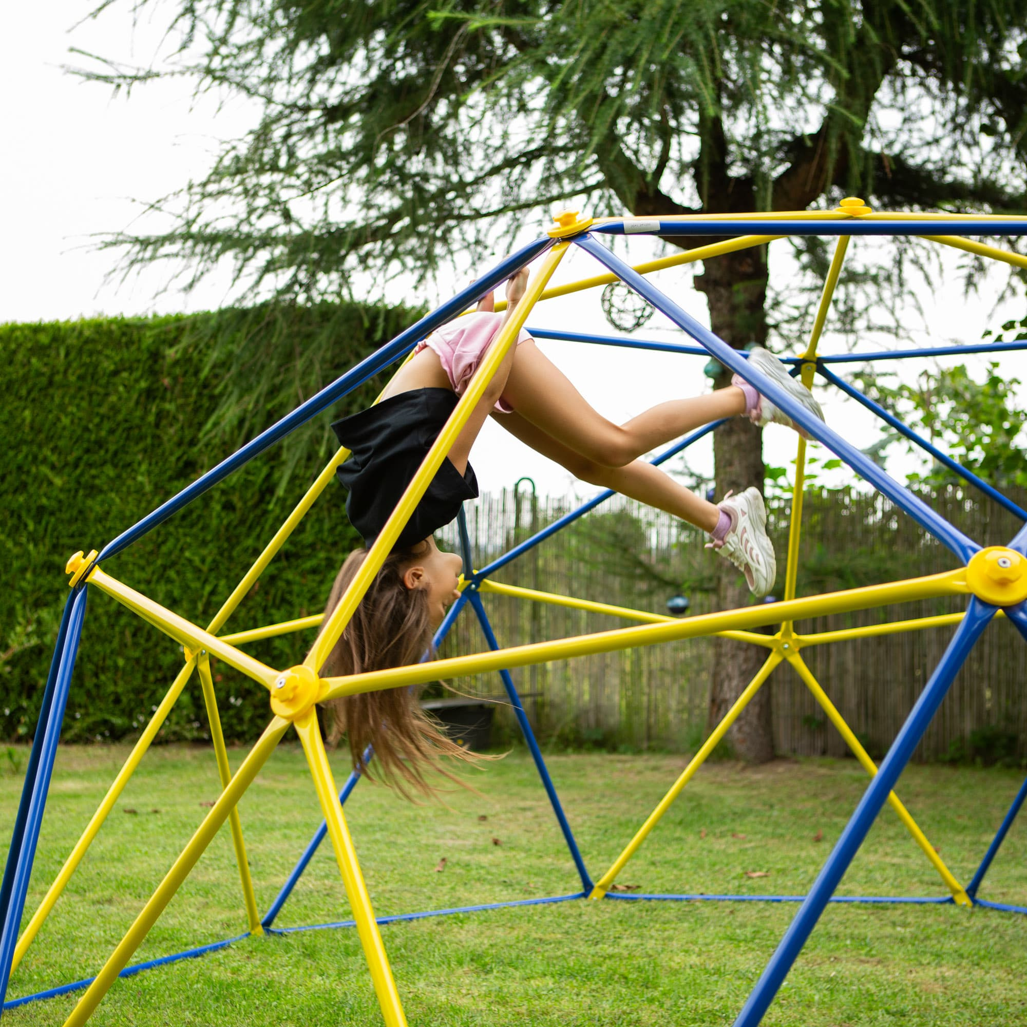 The geometric climbing dome is made of galvanised steel tubes. The external layer is powder-coated to prevent rust and fading. Connected with grips (which are also useful for climbing), the structure is durable and stable. The wide shape of the dome means no ground anchoring is needed for assembly. It can accommodate up to 12 people at once, with a maximum load capacity of 350kg, making it a safe play environment.