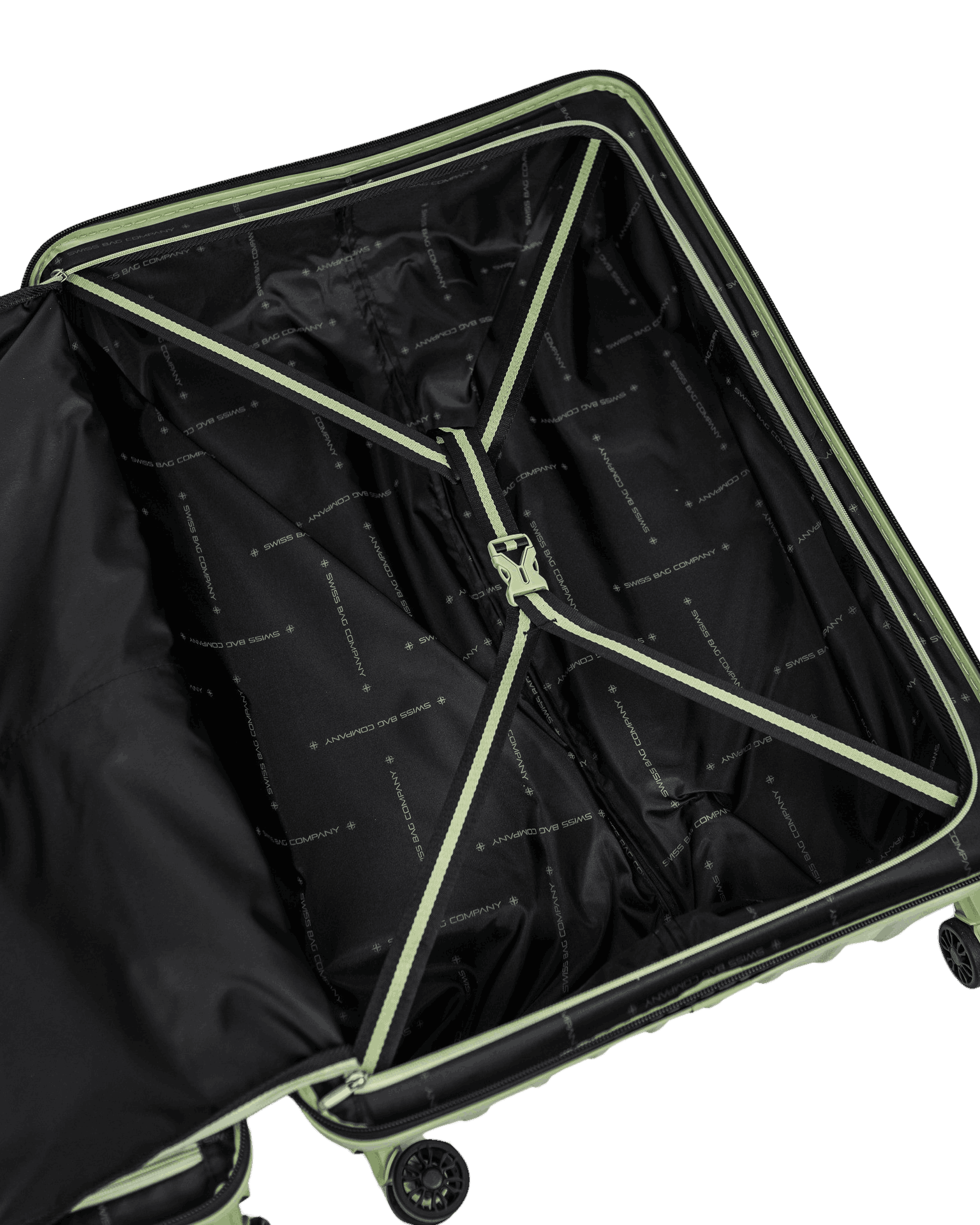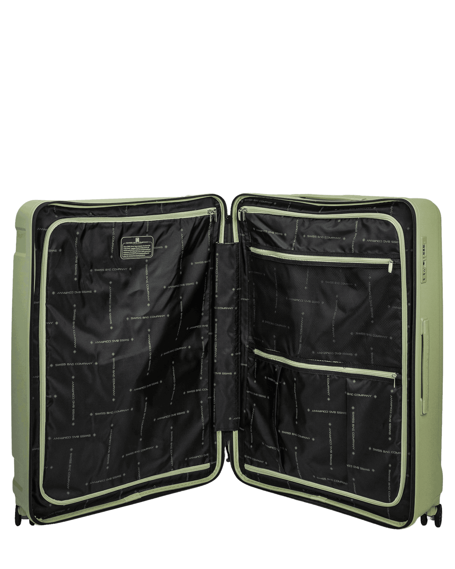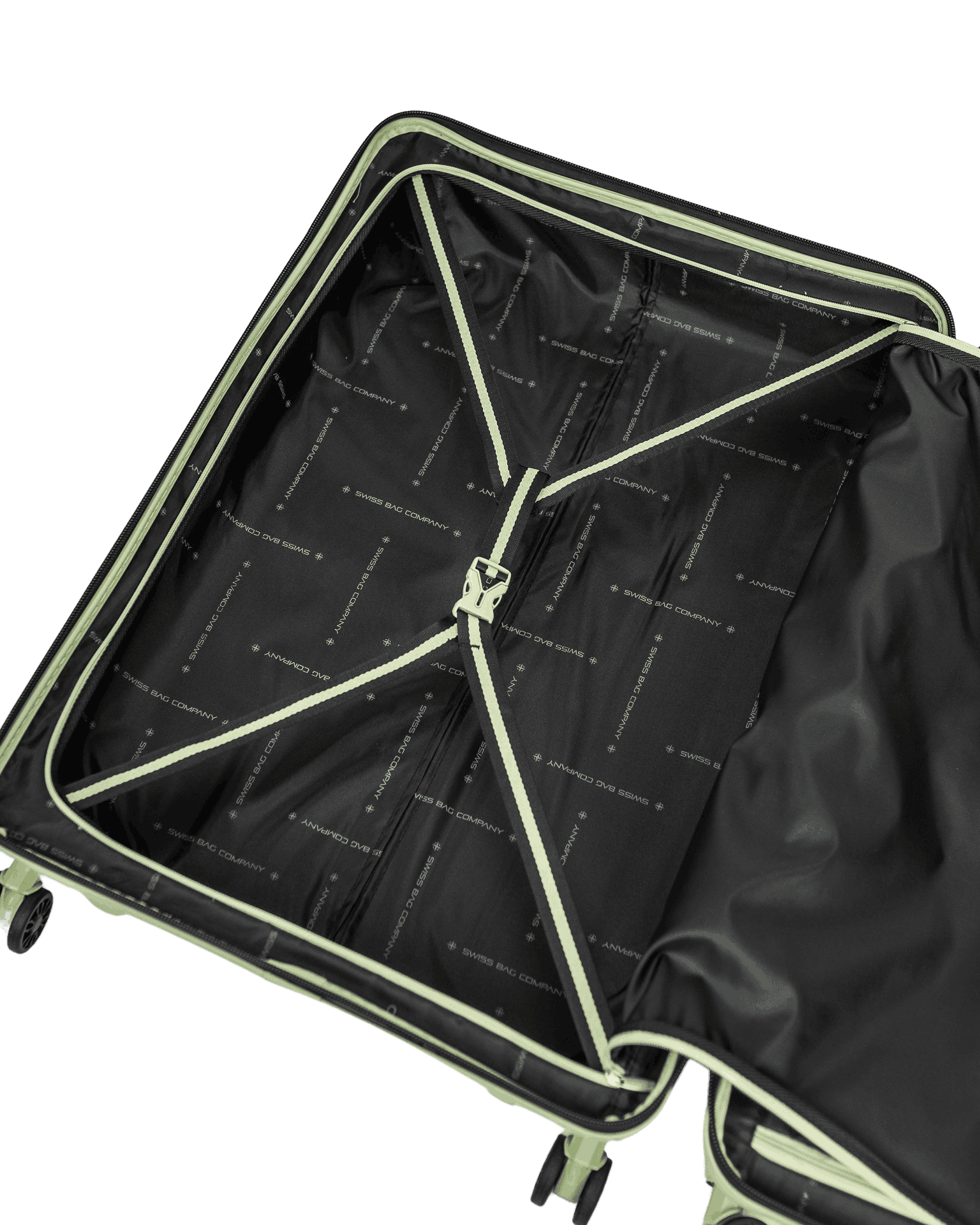 The interior of the suitcase is divided into two parts, with the lower compartment having adjustable straps to prevent luggage from shifting. The whole suitcase is complemented by elegant lining.