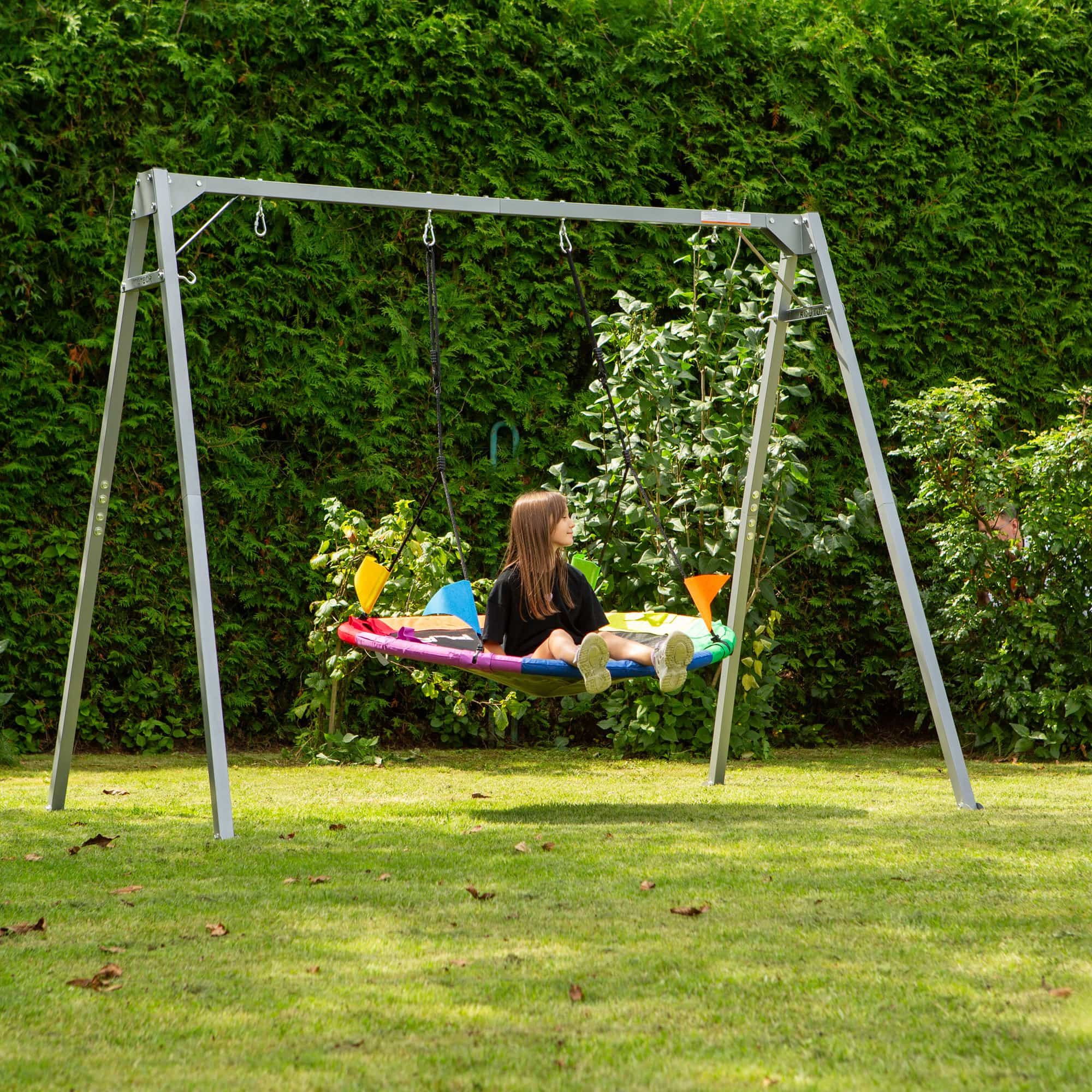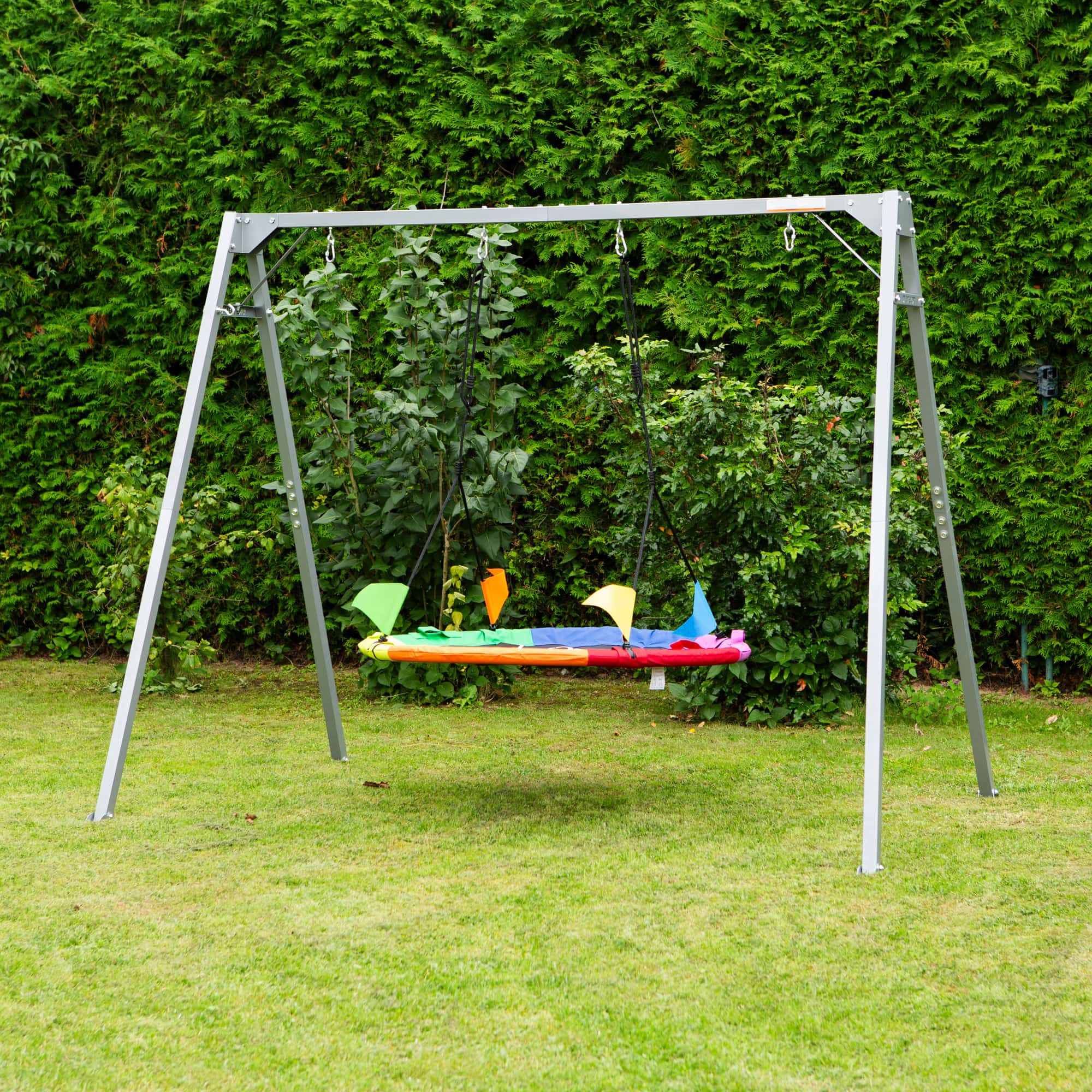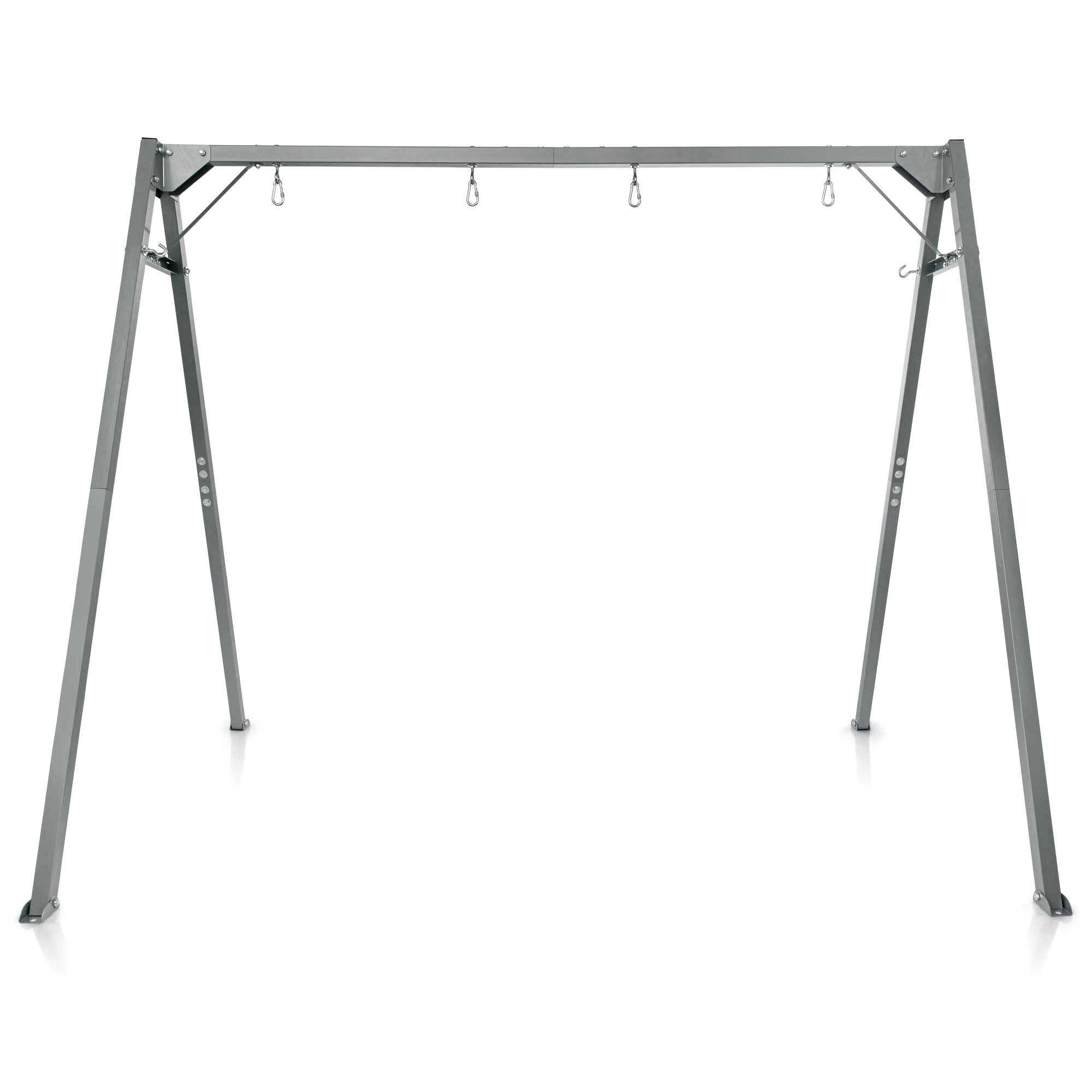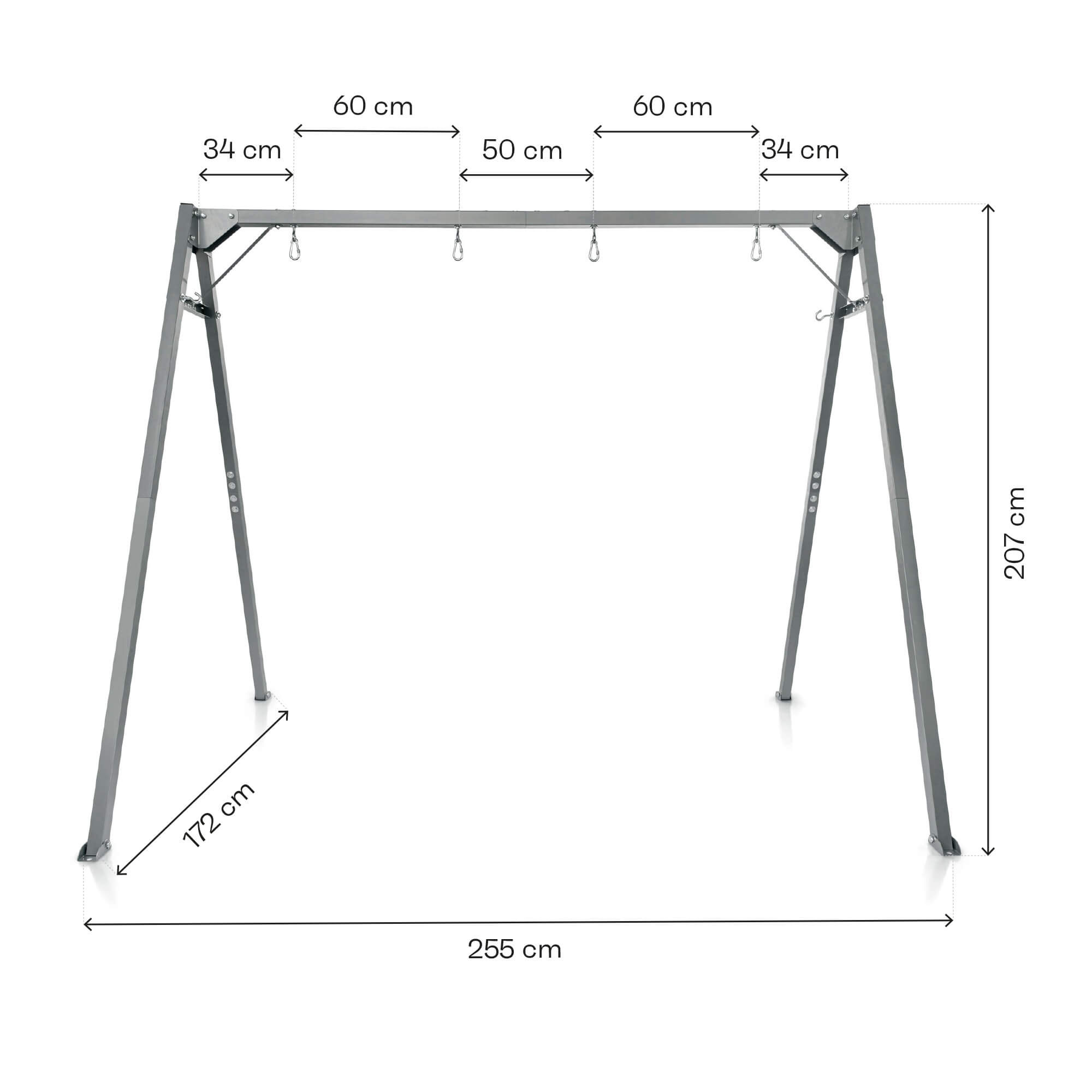 The construction is adapted for simultaneous installation and use of two items, e.g. two swings or a swing and a nest swing, etc. (not included). The frame is intended for outdoor use. It requires bolting together and secure anchoring to the ground. This is enabled by movable feet with holes located at the ends of the frame legs. Depending on the type of surface (concrete, grass) the feet can be fixed using anchors supplied with the set or screws or expansion plugs (not included).
