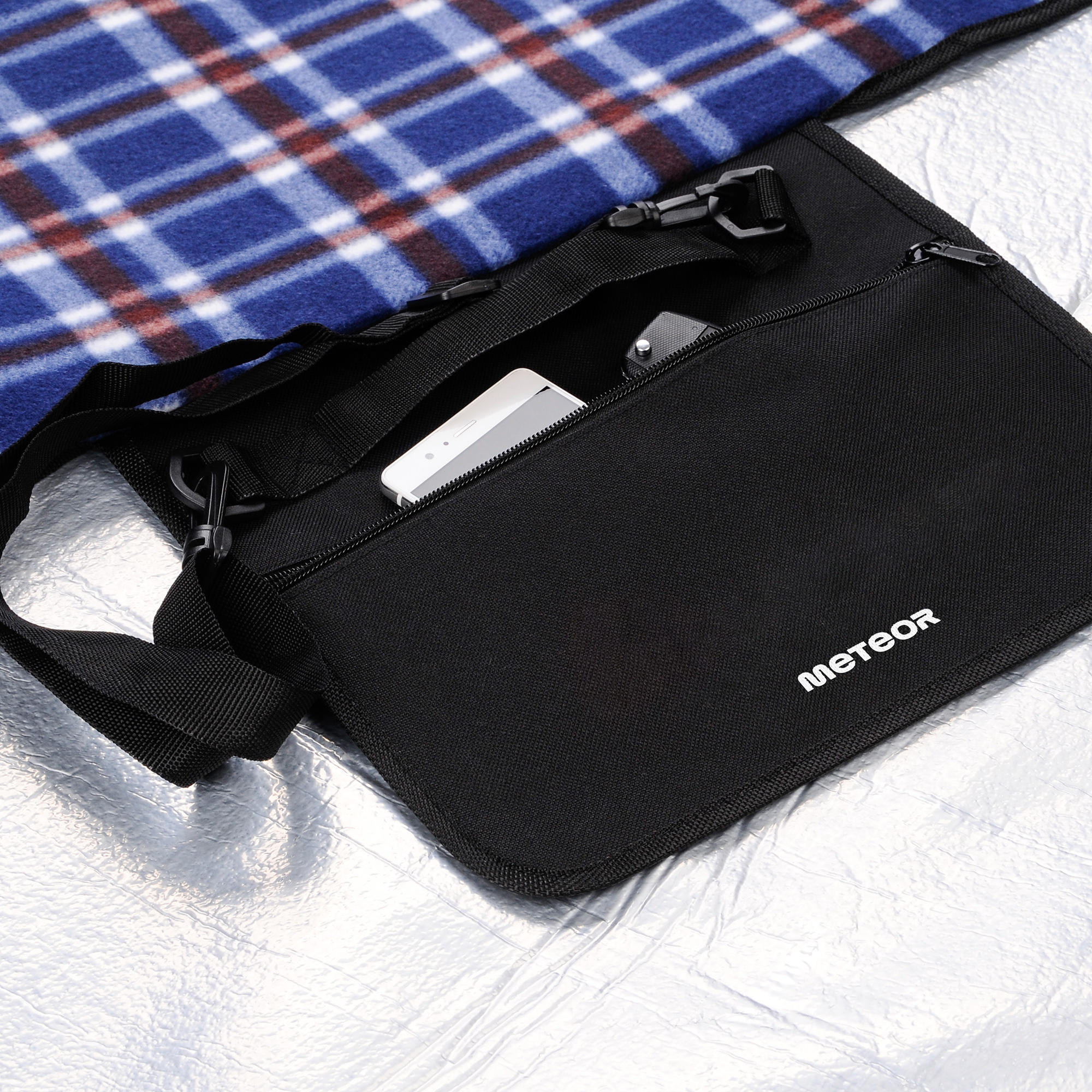 The blanket is easy to fold, takes up little space and a sewn handle and an adjustable shoulder strap make it easy to carry. Zipped pocket allows easy storage of keys, documents or wallet. Loops placed in each corner of the blanket make it easier to attach to the ground with herring.