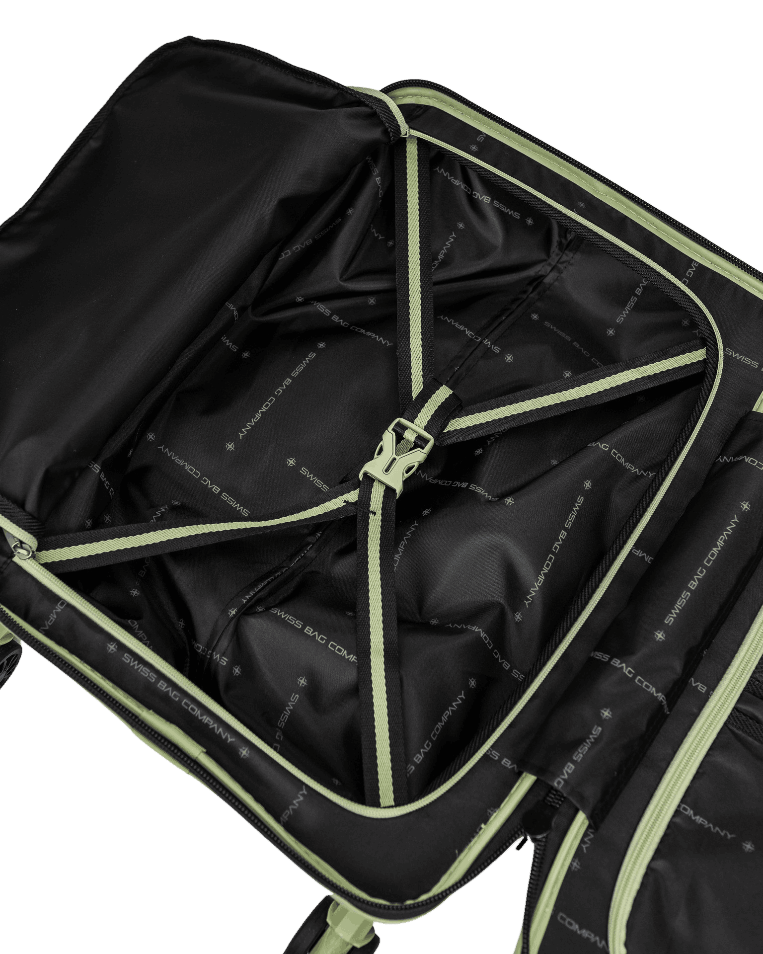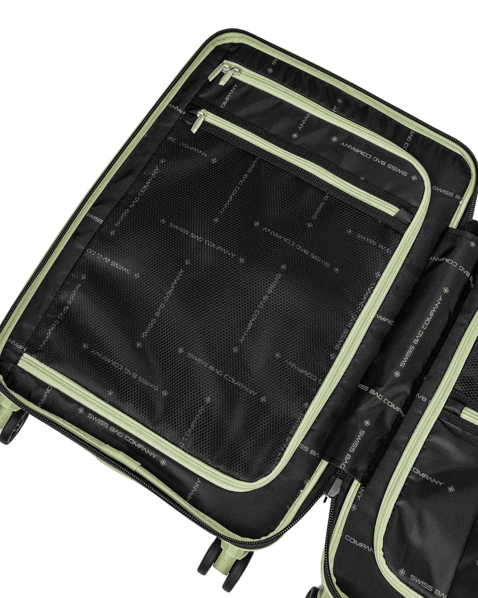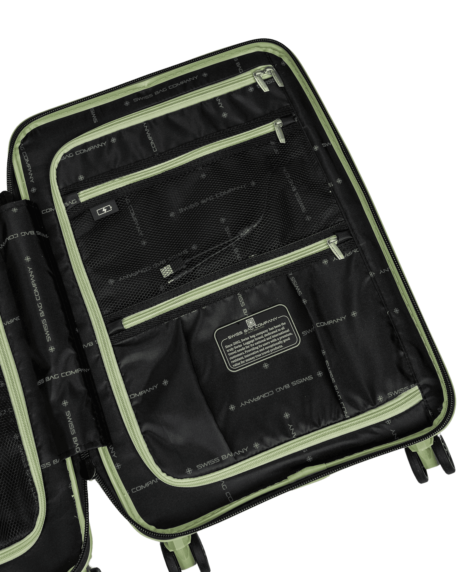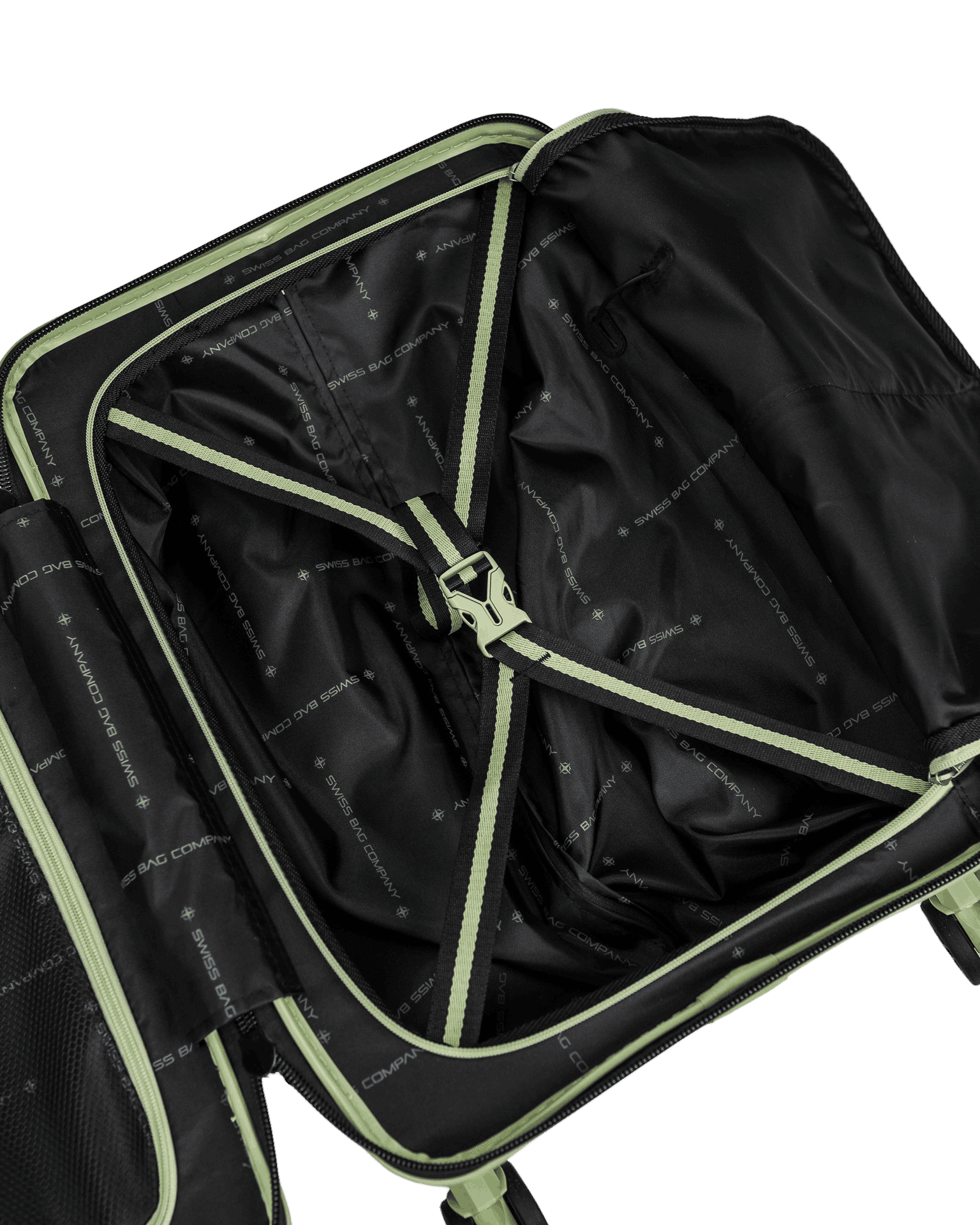 The interior of the suitcase is divided into two parts, with the lower compartment having adjustable straps to prevent luggage from shifting. The whole suitcase is complemented by elegant lining.