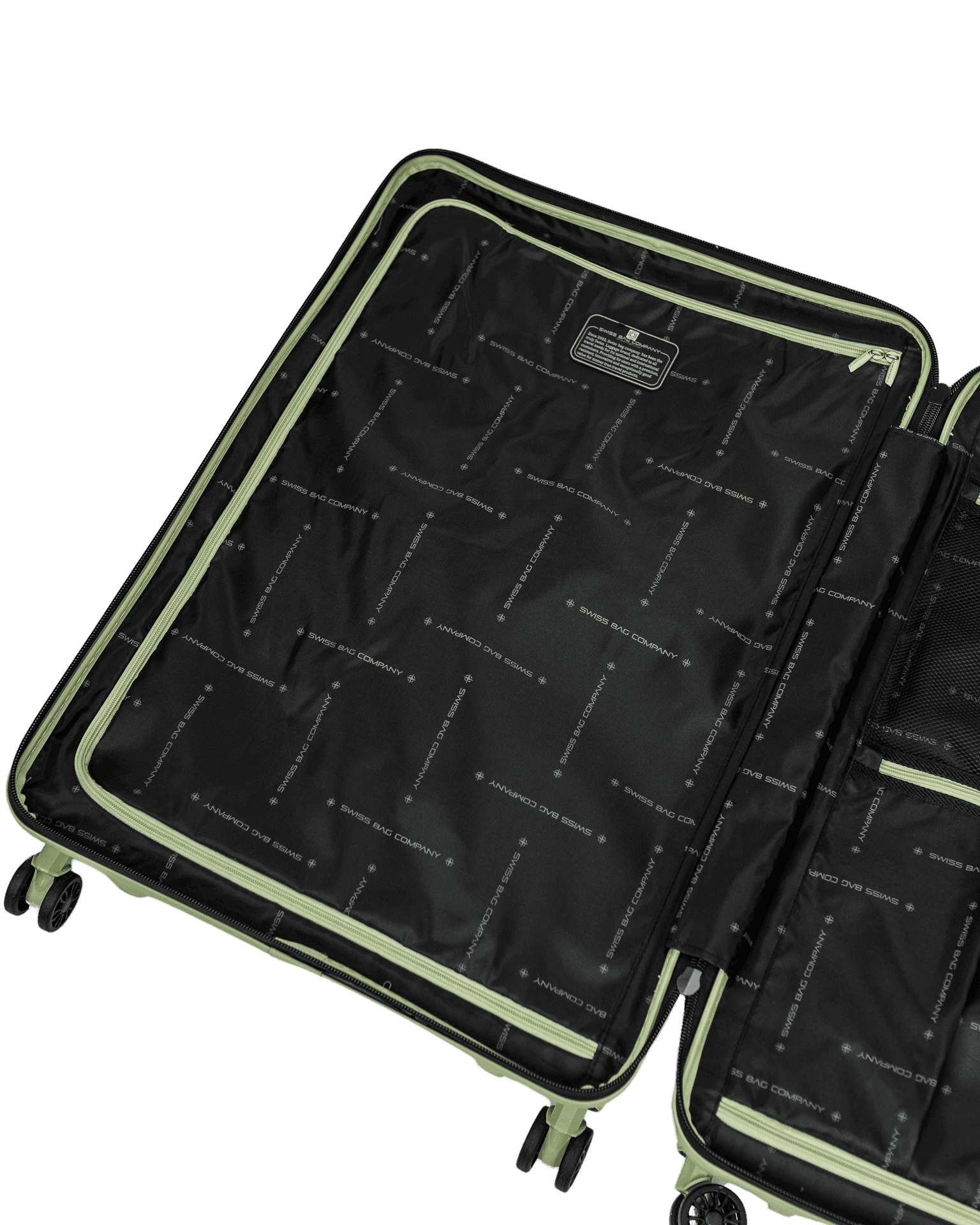 The interior of the suitcase is divided into two parts, with the lower compartment having adjustable straps to prevent luggage from shifting. The whole suitcase is complemented by elegant lining.