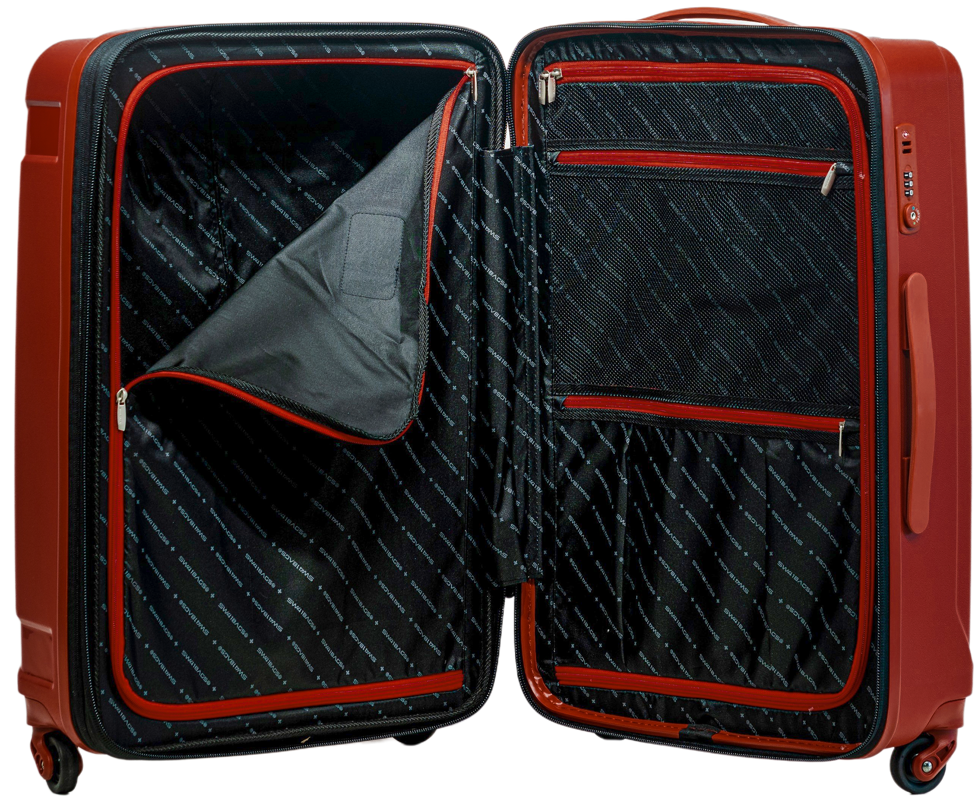 The interior of the suitcase is divided into two parts, with the lower compartment having adjustable straps to prevent luggage from shifting. The whole suitcase is complemented by elegant lining.