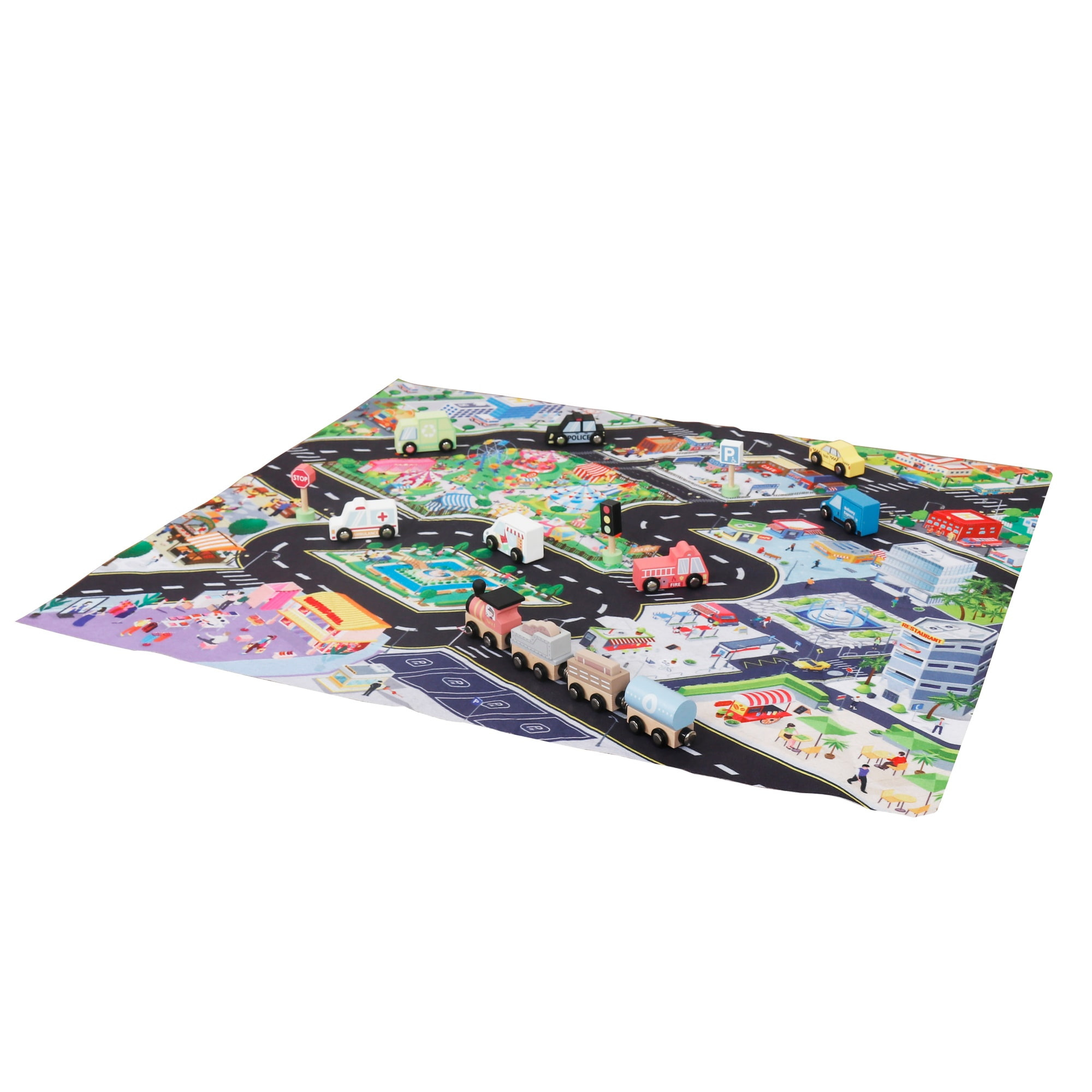 Large set – the wooden shelf holds a train with carriages, fire engine, ambulance, police car, taxi, courier van, ice-cream van, as well as road signs and traffic lights. The set also includes a mat with city streets that will take your child into a magical world full of adventures.