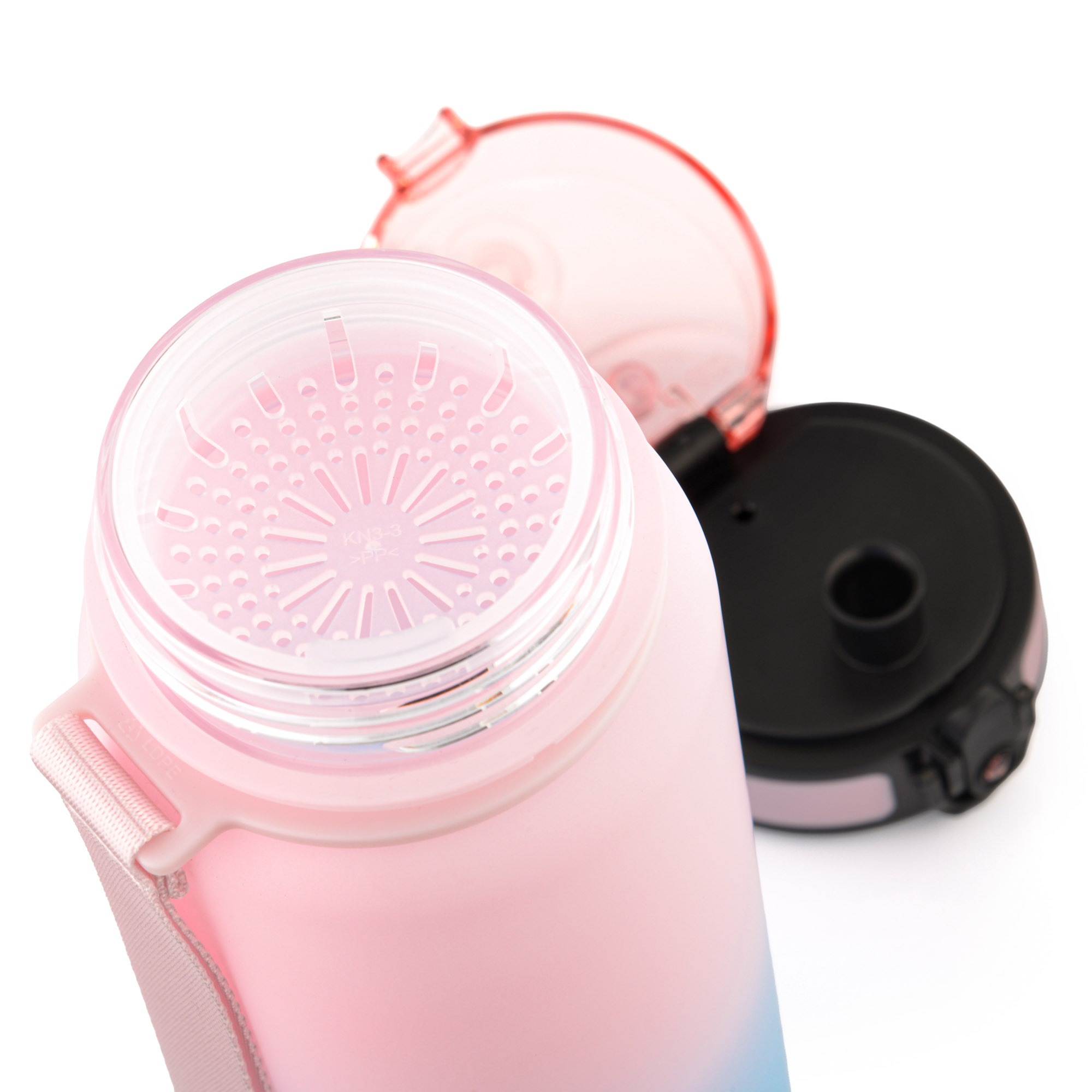 Uniwersalna butelka z matowym wykończeniem i powierzchnią antypoślizgową jest przyjemna w dotyku, a pasek na nadgarstek wygodny podczas codziennego noszenia i ruchu. Bidon został wyposażony w miarkę zachęcającą do regularnego nawadniania. Wyjmowany filtr (np. do owoców, herbaty czy kostek lodu) umożliwia wypełnienie butelki ulubionym napojem, bez obaw o zatkanie ustnika.