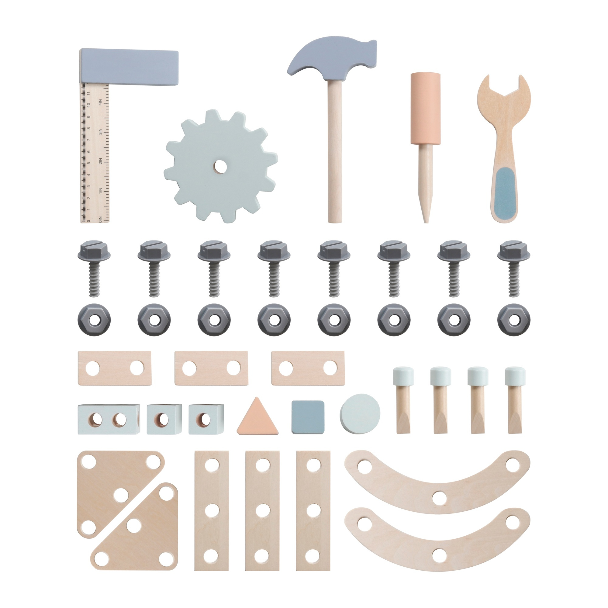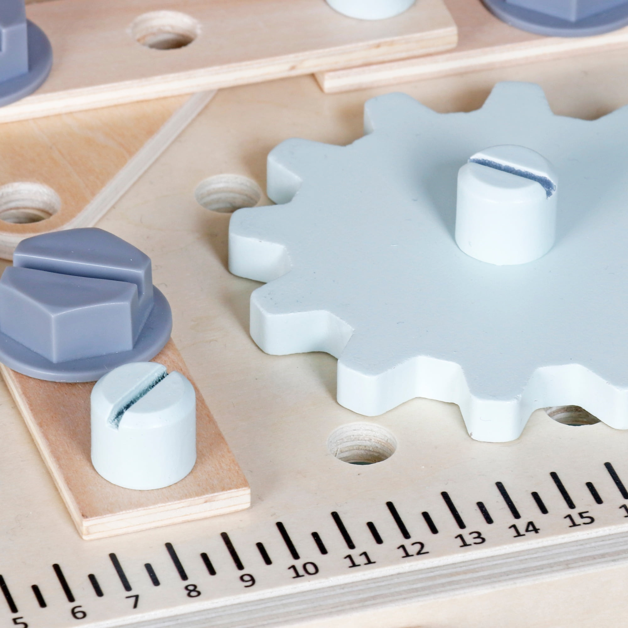 Na wyposażeniu zestawu znajduje się mnóstwo interesujących akcesoriów. Stabilny stół roboczy to prawdziwe centrum inspiracji dla każdego małego inżyniera. Można przy nim przykręcać i odkręcać śruby, mocować deseczki i klocki, a także korzystać z prawdziwego imadła do stabilnego przytrzymania elementów podczas 'napraw'. Dodatkowe narzędzia takie jak młotek, śrubokręt i klucz, umieszczone są w specjalnych uchwytach, dzięki czemu maluch ma je zawsze pod ręką.