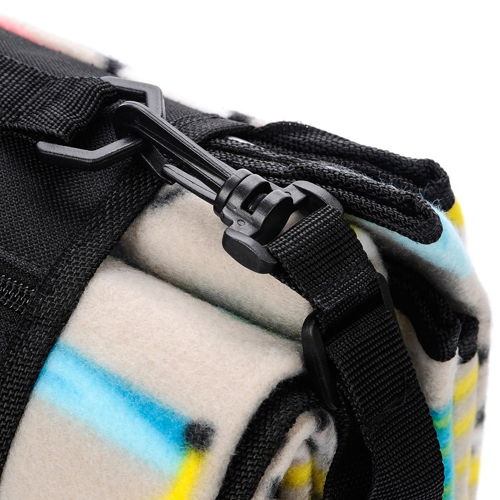 Koc można łatwo złożyć, zajmuje przez to niewiele miejsca a doszyta rączka oraz regulowany pasek na ramię ułatwiają jego przenoszenie. Kieszeń zamykana na zamek błyskawiczny umożliwia łatwe przechowywanie kluczy, dokumentów czy portfela. Pętelki umieszczone w każdym rogu koca ułatwiają przymocowanie do podłoża za pomocą śledzi.