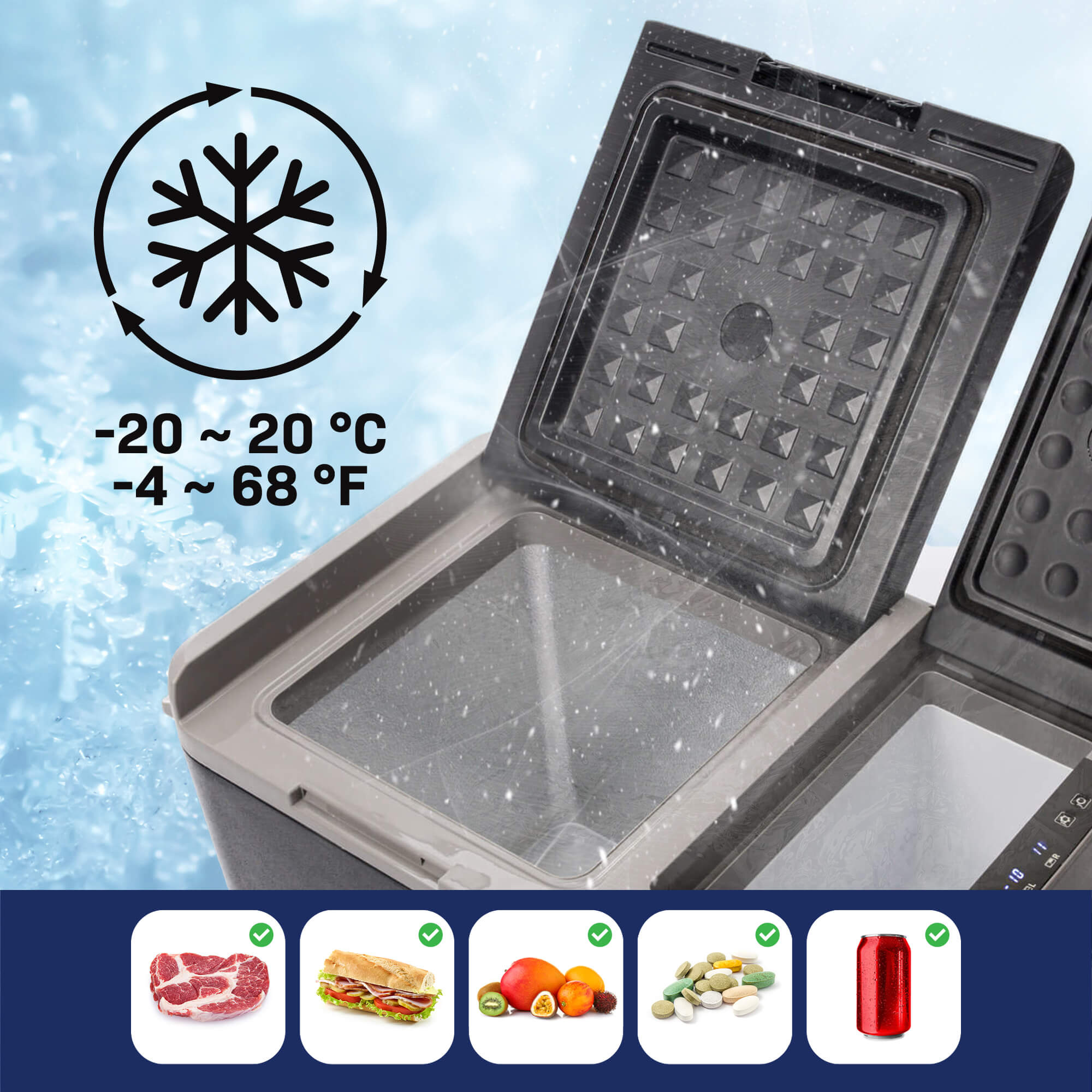 Dwie komory o pojemności 40L zapewniają wygodny dostęp do przechowywania żywności i napojów. Większa komora chłodzi i mrozi większe produkty, a mniejsza doskonale nadaje się do przechowywania leków, owoców, czy puszek. Dzięki technologii kompresorowej lodówka skutecznie utrzymuje temperatury od +20°C do -20°C, oferując opcje grzania, chłodzenia oraz głębokiego mrożenia.
