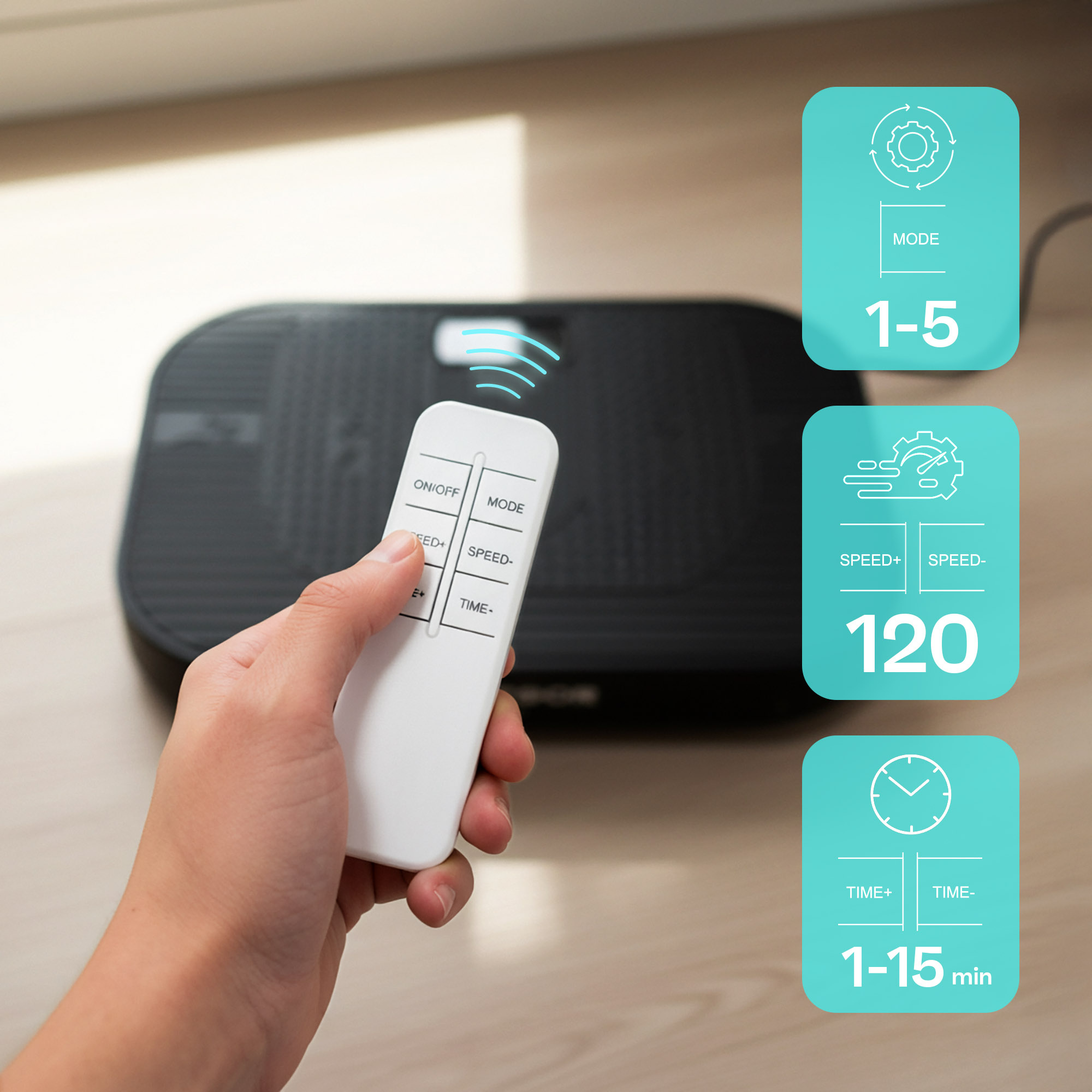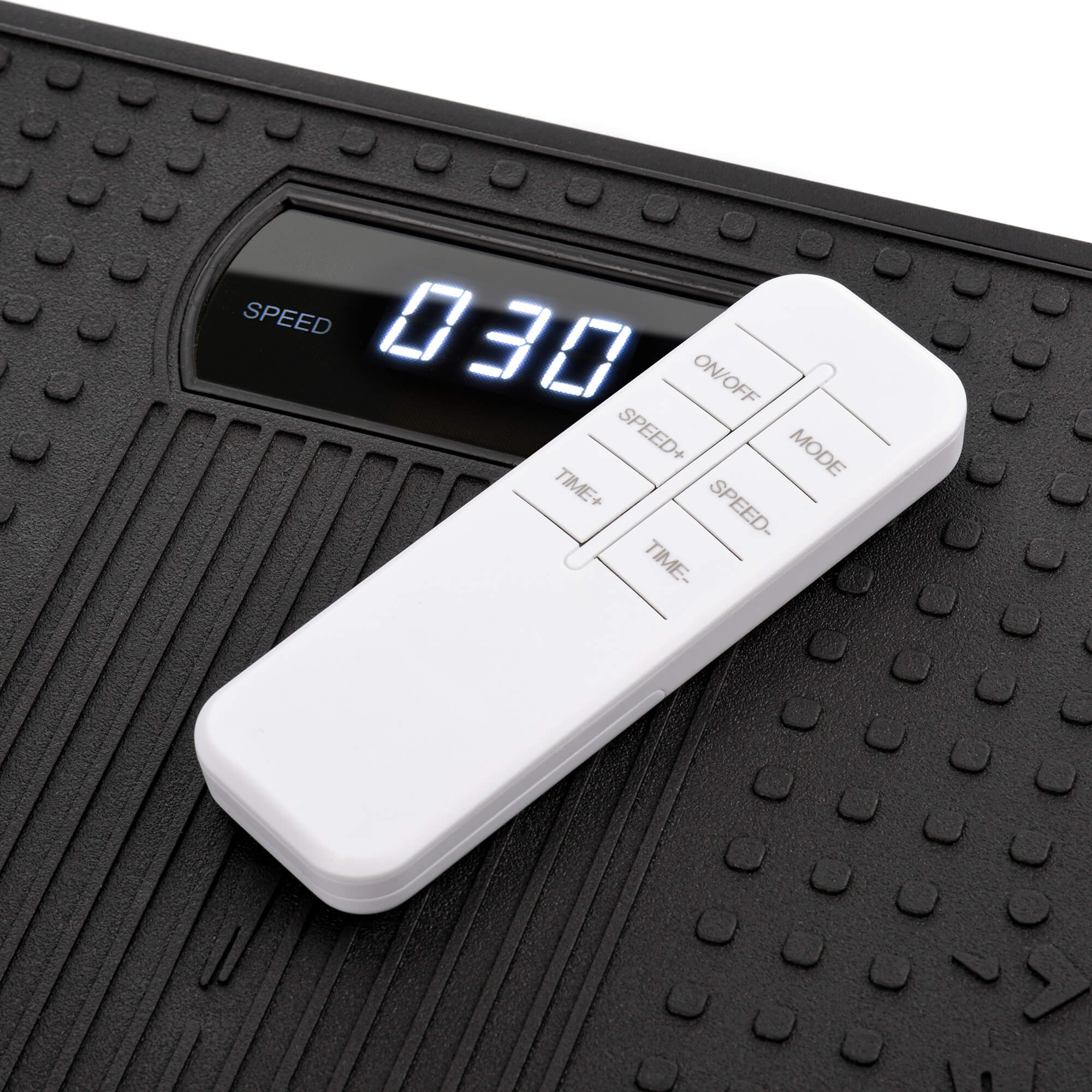 Panel sterowania wyświetla czas ćwiczeń, prędkość drgań oraz aktualny program. Na wyświetlaczu jest także umieszczony czujnik zdalnego sterowania, dzięki któremu platformą można sterować za pomocą pilota dołączonego do zestawu. Urządzenie oferuje 5 programów treningowych, jednak istnieje także możliwość ustawienia dowolnego trybu manualnego. Użytkownik może sam wybrać czas trwania treningu (10-15min) oraz intensywność wibracji (1-120).