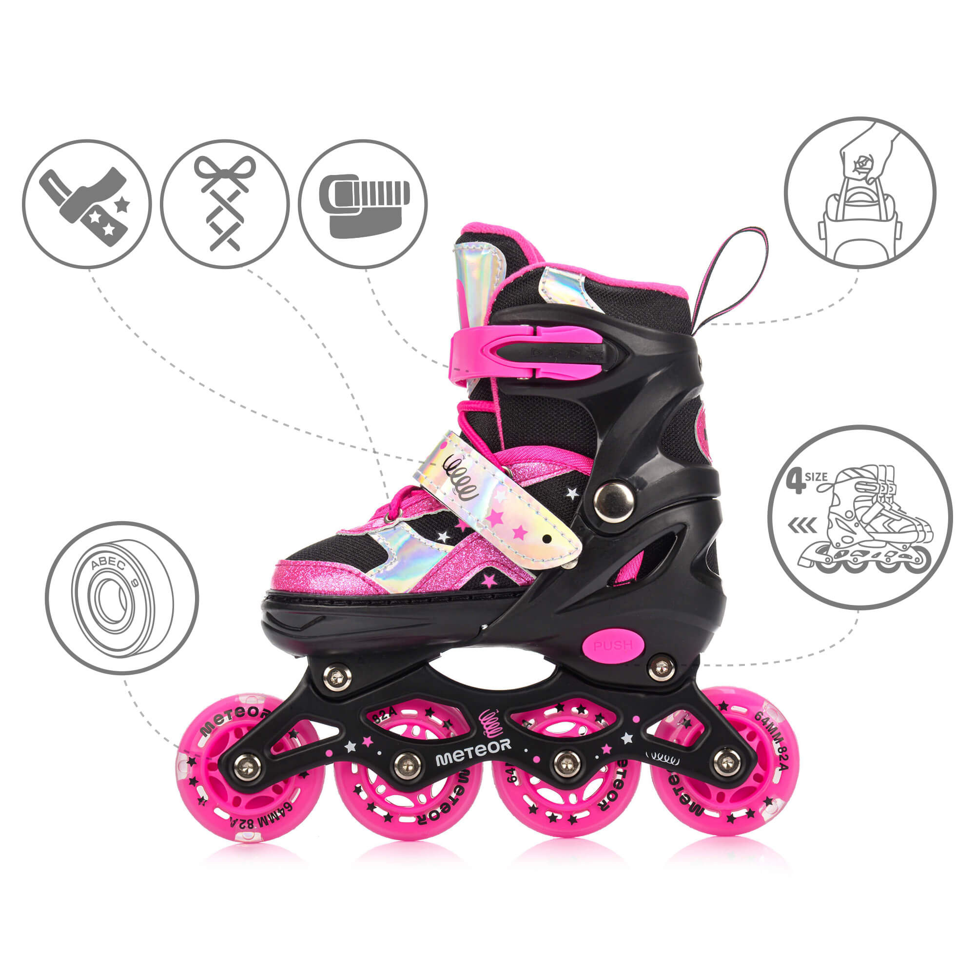 Regulowany rozmiar buta – rolki Meteor Metro posiadają regulowany but, który pozwala na dopasowanie do czterech różnych rozmiarów stopy. To praktyczne rozwiązanie zapewnia idealne dopasowanie i komfort przez długi czas – rolki będą rosnąć wraz z Twoim dzieckiem i posłużą przez kilka sezonów!