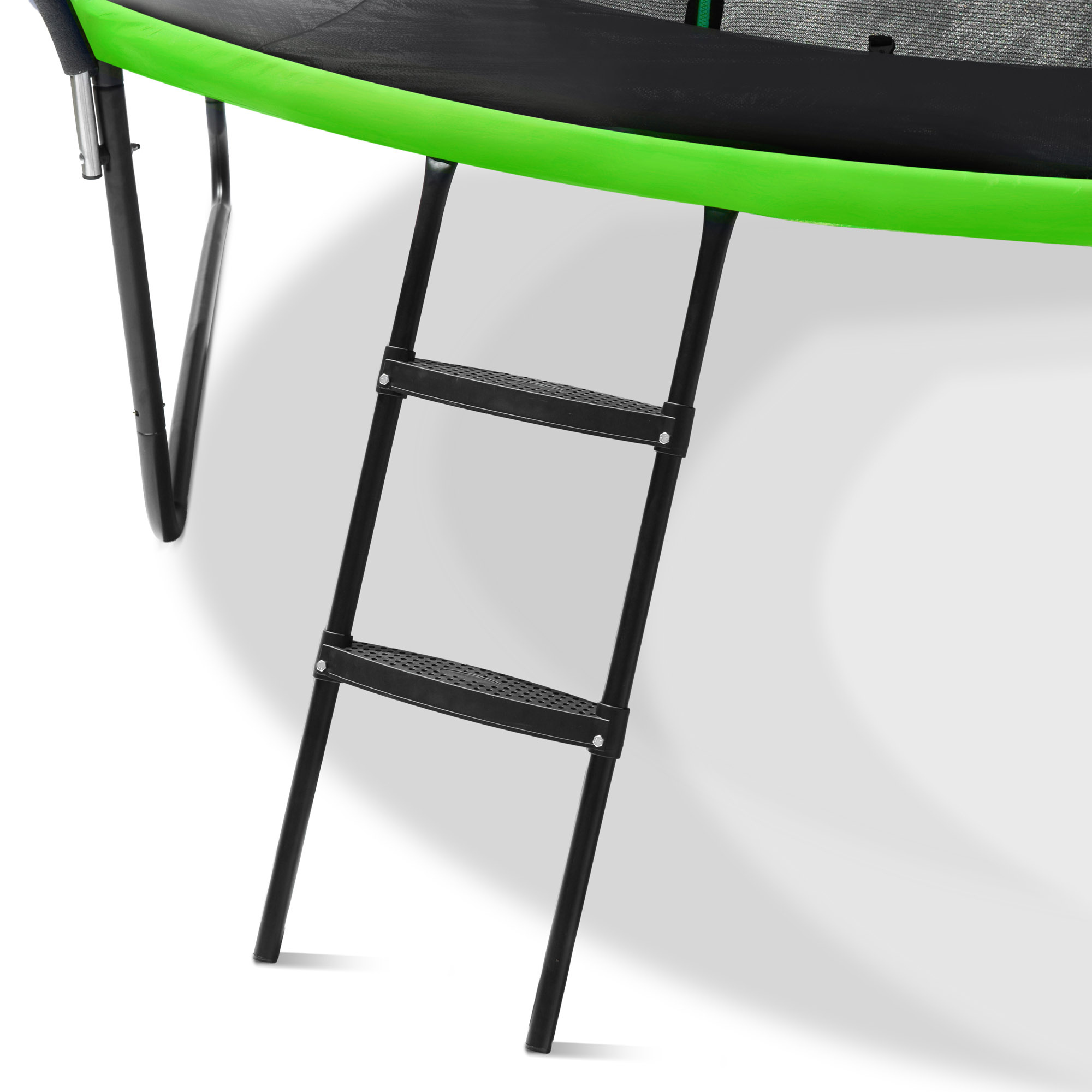 Siatka o gęstym splocie, umieszczona wewnątrz konstrukcji, pozostaje równomiernie naprężona na okrągłym stelażu nawet podczas intensywnego użytkowania. Dzięki wykonaniu z materiałów PE siatka oferuje wytrzymałość oraz niezwykle ważną elastyczność. Zabezpieczona zamkiem błyskawicznym w kształcie litery „L” oraz klamrami zatrzaskowymi maksymalizuje wygodę i chroni przed przypadkowym otwarciem. Dostęp do trampoliny umożliwia także 2-stopniowa drabinka.