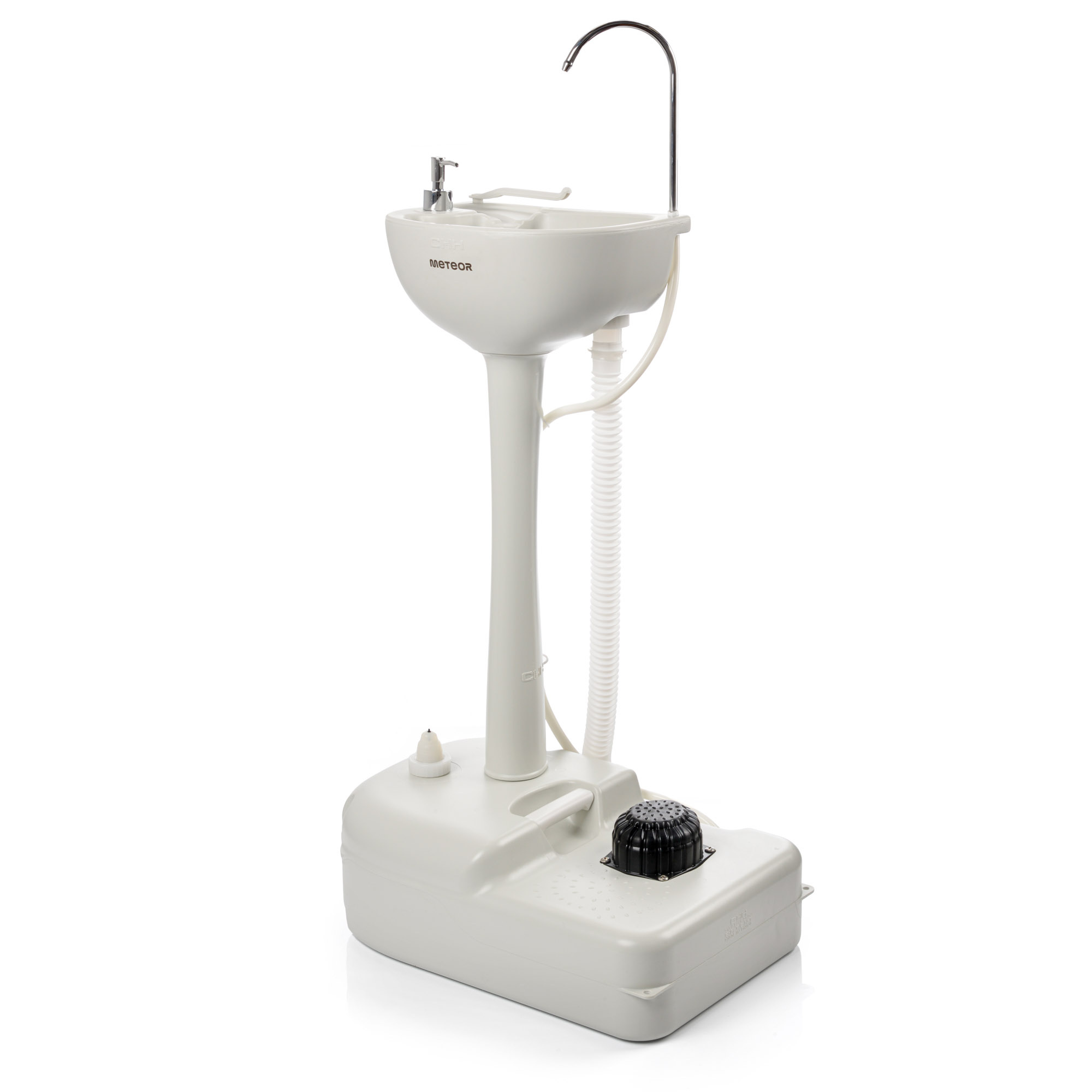 W skład umywalki wchodzi zbiornik bazowy o pojemności 17 litrów czystej wody, 3-litrowy dozownik na mydło w płynie lub środek dezynfekujący oraz wysuwany uchwyt na ręczniki. Dzięki wyposażeniu w elastyczny wąż odpływowy o zasięgu od 31cm do 130cm, gwarantuje pełną funkcjonalność na każdym kroku. Nie potrzebuje podłączenia do kanalizacji i wodociągu. Rurę odpływową można podłączyć do przenośnej toalety lub zbiornika wody w celu zbierania zużytej wody.