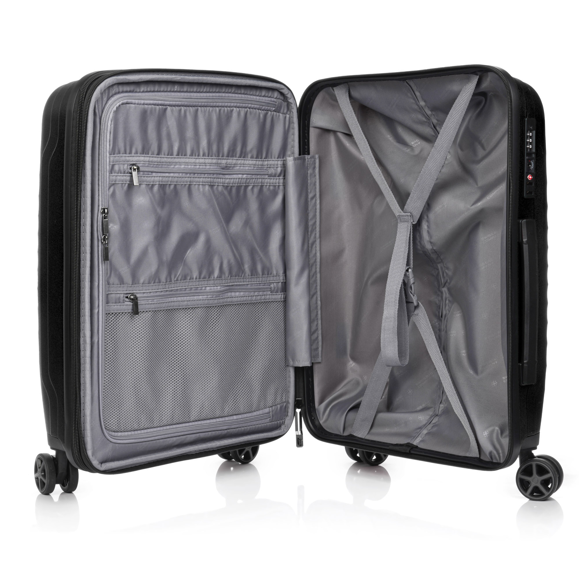 Wnętrze walizki podzielone jest na dwie komory. Jedna z nich posiada małe kieszonki usprawniające organizację mniejszych rzeczy i drobiazgów, w drugiej znajduje się miejsce na odzież i większy bagaż. Duża przegroda wyposażona jest także w pasy zabezpieczające zawartość walizki przed przemieszczaniem. Wyściełane wnętrze jest odporne na przetarcia i ułatwia utrzymanie porządku.