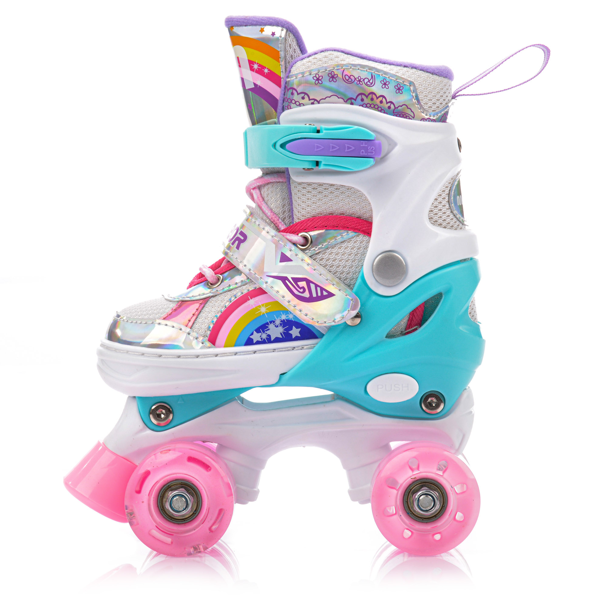 Kolorowy design i świecące kółka - wrotki Meteor przyciągają wzrok swoim błyszczącym i atrakcyjnym wzornictwem oraz świecącymi LEDowymi kółkami. Kółka przednie i tylne świecą podczas jazdy na barwne kolory, co dodaje magii każdej przejażdżce, zwłaszcza po zmroku. Dodatkowo, rolki mają piękne, brokatowe kolory, które sprawią, że Twój maluch wyróżni się na podwórku i doda koloru swoim przygodom na wrotkach.