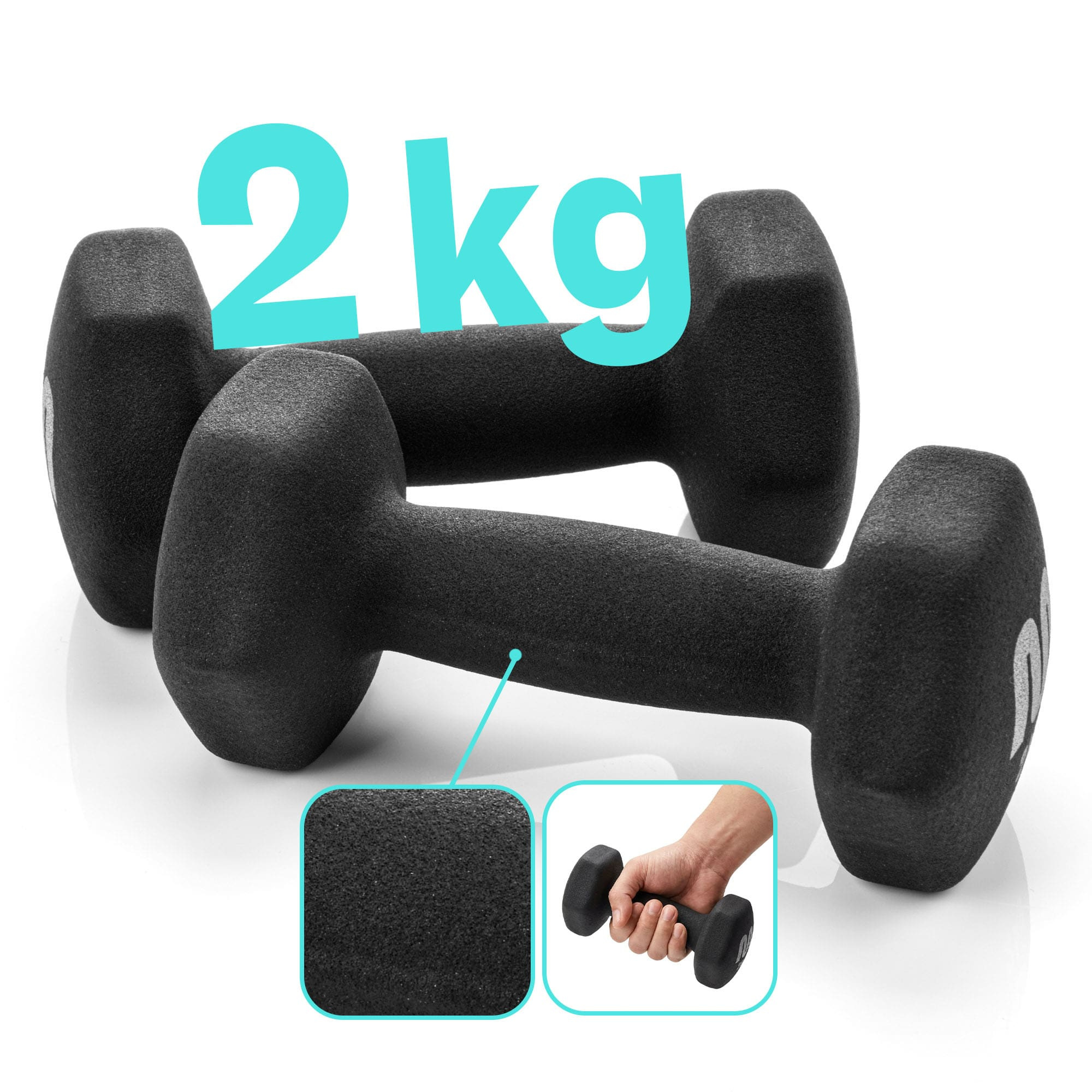- Zestaw zawiera jedną parę hantli o masie 2x2kg.
